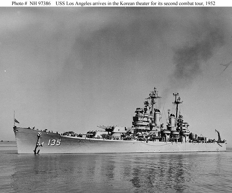 USS Los Angeles (CA 135) Operating off Korea with Task Force 77, August 1951. Official U.S. Navy Photograph, from the collections of the Naval Historical Center #NH 97387. |