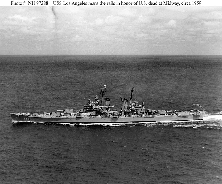 USS Los Angeles (CA 135) "Officers and men of USS Los Angeles honor U.S. dead at Midway" (quoted from the original photo's caption). Photo was presumably taken off the Midway Islands. The original print bears a stamped date of 27 April 1959. Official U.S. Navy Photograph, from the collections of the Naval Historical Center #NH 97388. |