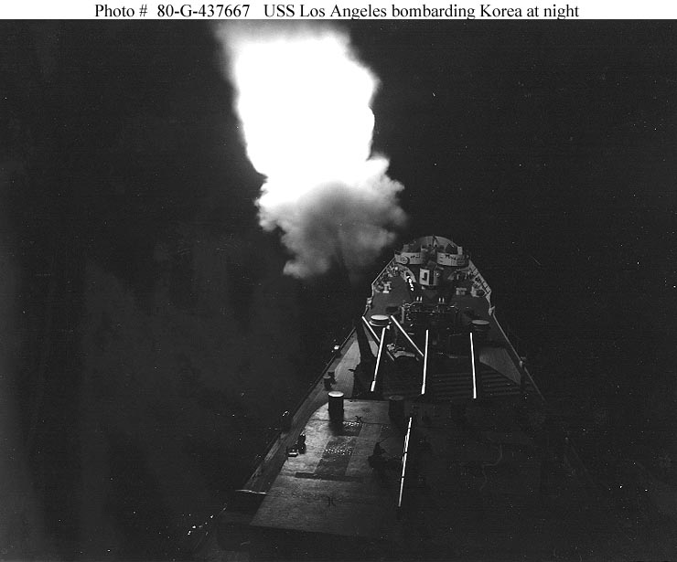 USS Los Angeles (CA 135) Fires her forward 8-inch guns during a night bombardment of the North Korean coast. Photograph is dated 8 June 1951. Official U.S. Navy Photograph, now in the collections of the National Archives #80-G-437667. |