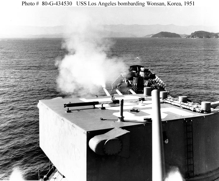 USS Los Angeles (CA 135) Firing her forward 8-inch guns on enemy targets at Wonsan, North Korea. Photograph is dated 15 October 1951. Note ship's hull number ("135") painted atop turret # 2. Official U.S. Navy Photograph, now in the collections of the National Archives #80-G-434530. |