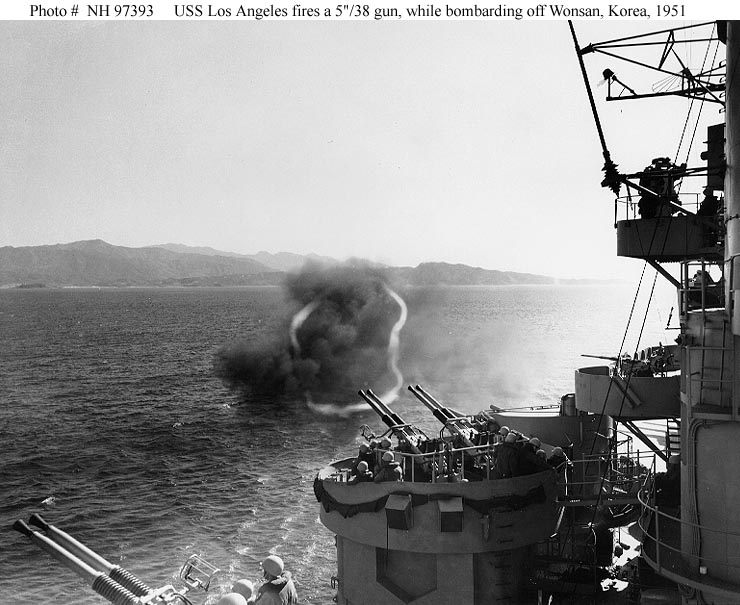 USS Los Angeles (CA 135) Fires a 5"/38 gun during a bombardment of Wonsan harbor, Korea, circa mid-1951. Note smoke ring, a feature frequently seen when firing 5"/38 guns. Some of the cruiser's 40mm guns are in the foreground. Official U.S. Navy Photograph, from the collections of the Naval Historical Center #NH 97393. |