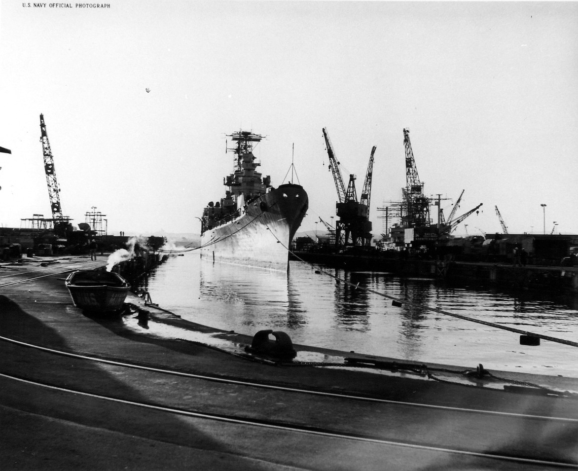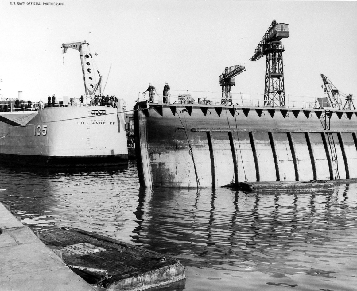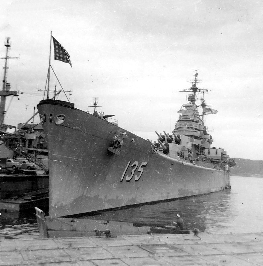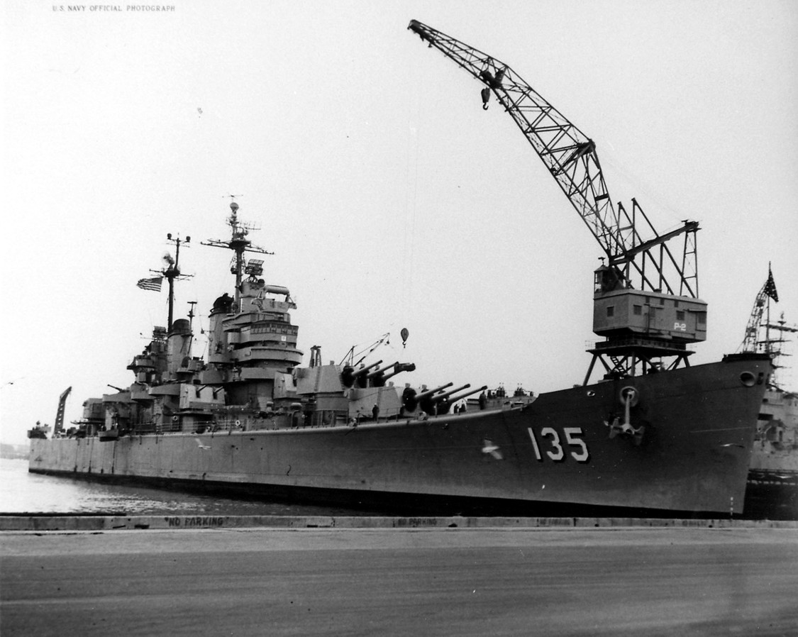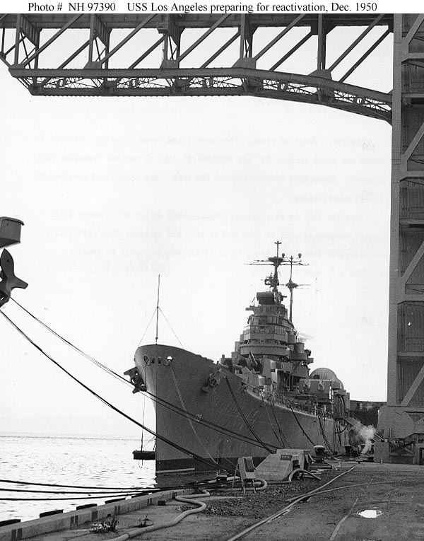 USS Los Angeles (CA 135) "The first phase of reactivation work began today (Tuesday, December 5) aboard the heavy cruiser USS Los Angeles (CA 135) at the San Francisco Naval Shipyard. Today, Yard workmen removed the ship's gun covers and prepared for all-out reactivation. When the ship is re-commissioned, probably during mid-January 1951, special ceremonies will be held and it is hoped by local Navy officials that the Honorable Fletcher Bowrow, Mayor of Los Angeles, will be present." Text quoted from the original photo caption, which was released on 5 December 1950. The ship recommissioned on 27 January 1951, following reactivation work at Hunter's Point, San Francisco, California, where this photograph was taken. Official U.S. Navy Photograph, from the collections of the Naval Historical Center #NH 97390. |