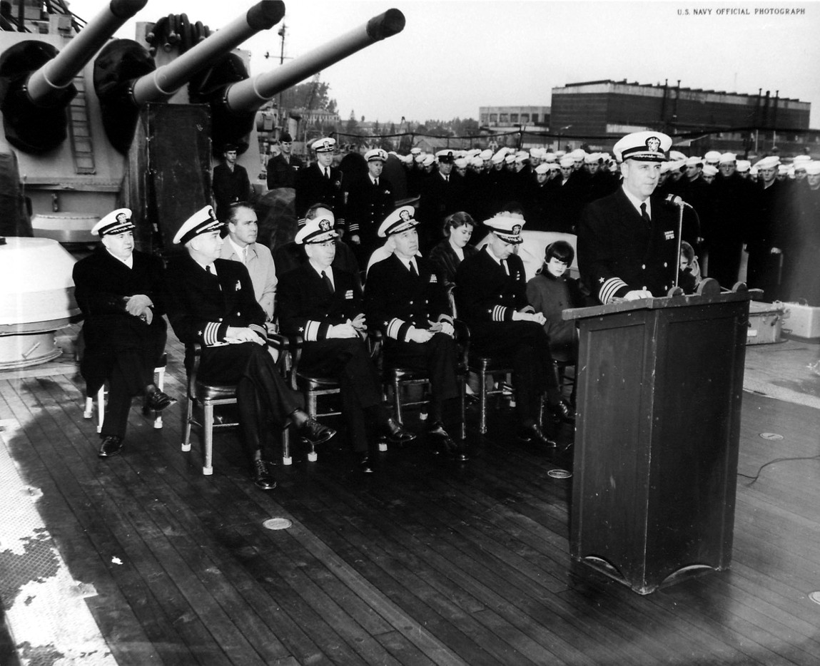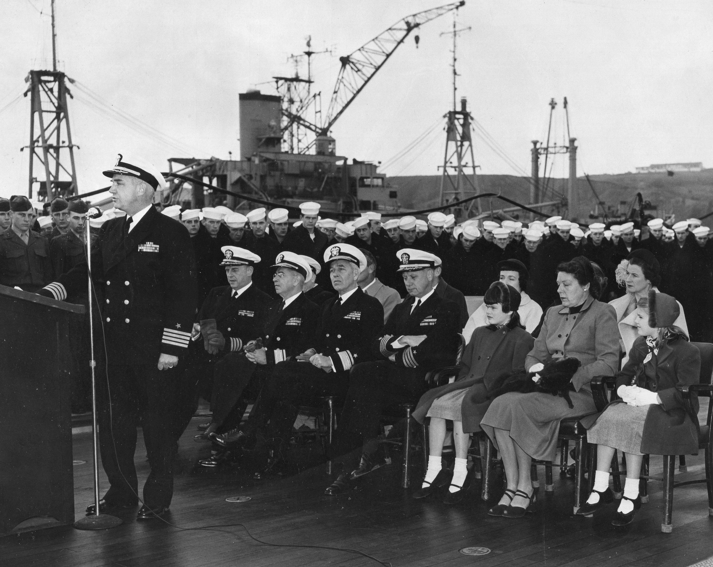 81k | Commissioning ceremony; Captain Snackenberg (center) and ship's sponsor, Mrs. Fletcher Bowron to his left. | USN |