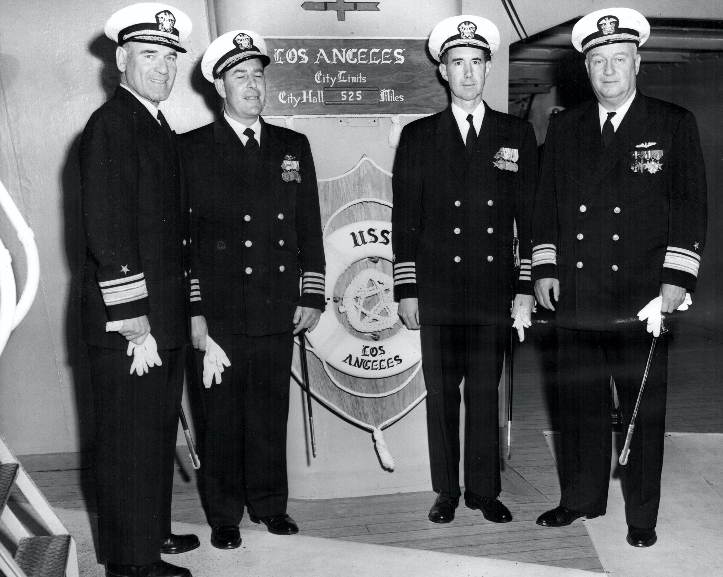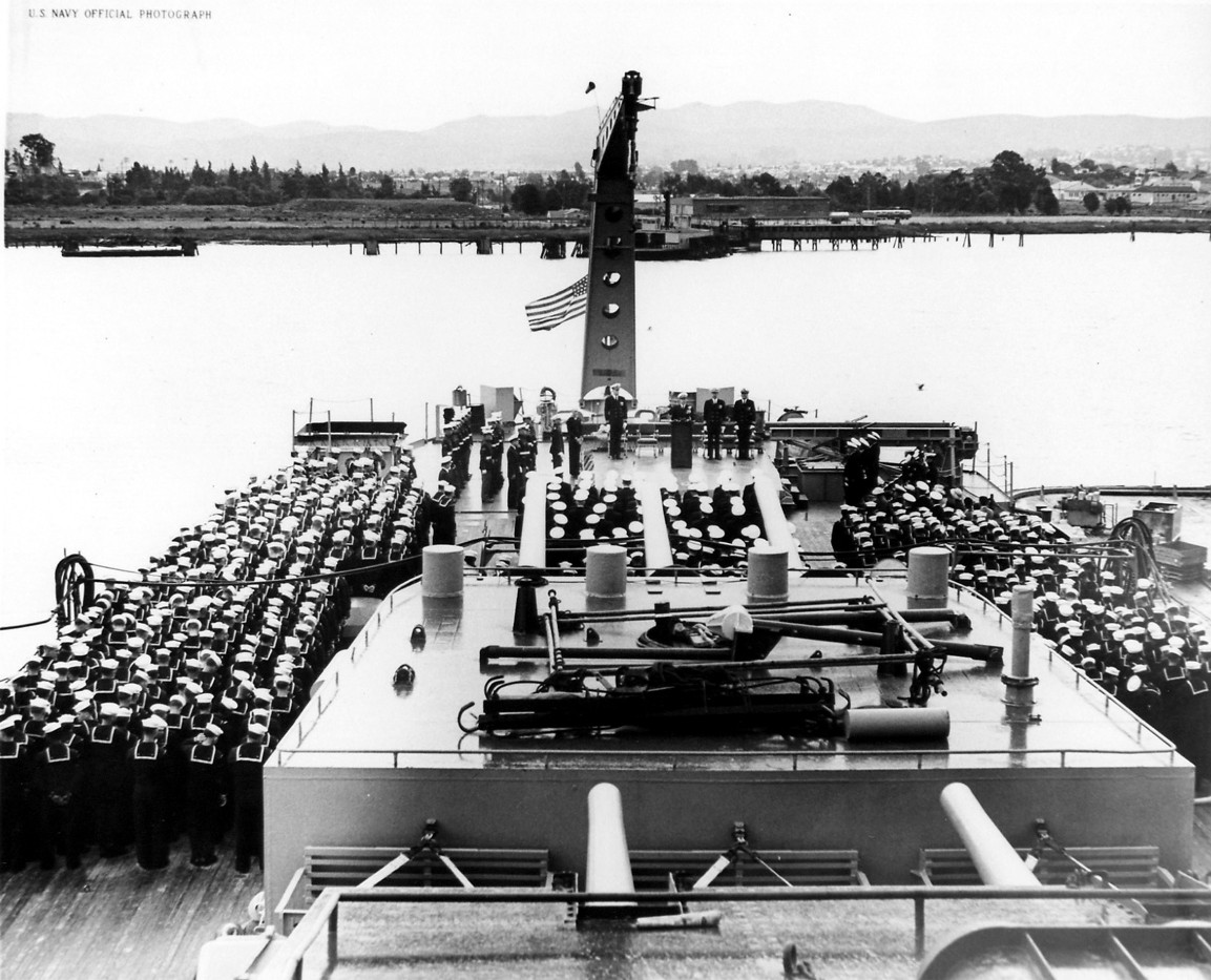 Change of Command ceremonies aboard USS Los Angeles (CA 135) at Mare Island on 9 January 1952. U.S. Navy Photo #11517-1-52 |