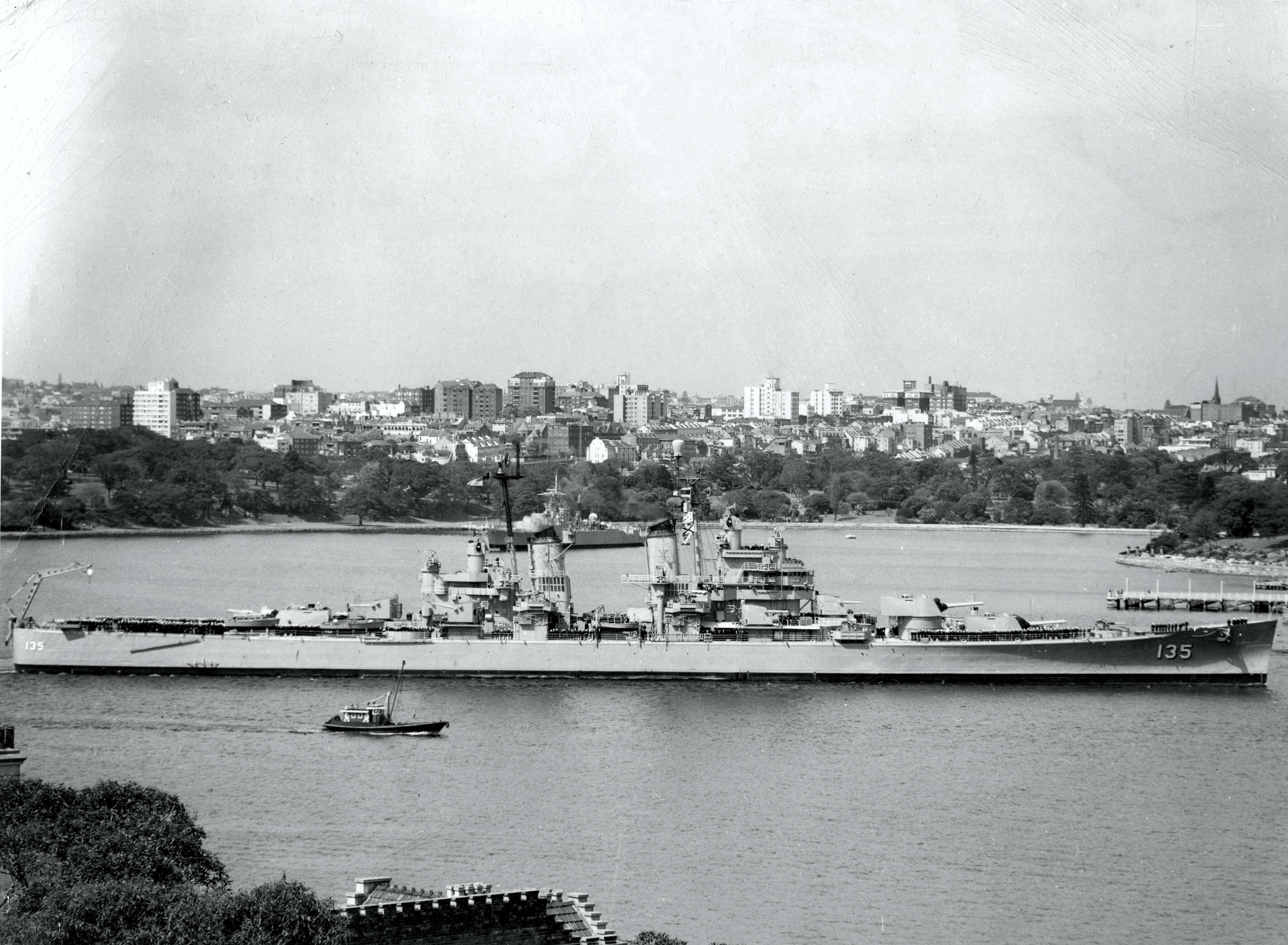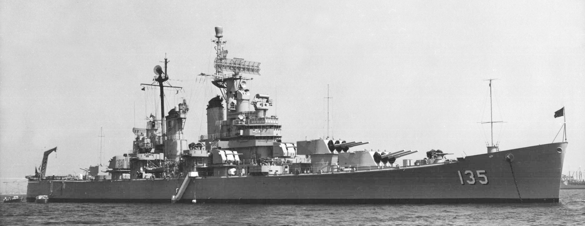 173k | Two Baltimore class cruisers USS Los Angeles (CA 135) (background) and USS Chicago (CA 136) on 21 August 1944 at the Philadelphia Navy Yard, afloat one day after they were launched in the dry dock that they were built. Philadelphia Evening Bulletin, George D. McDowell Collection |