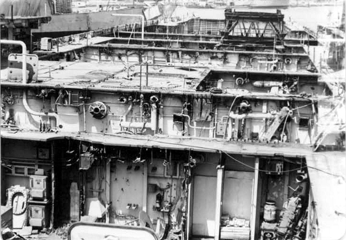 Looking aft from port side midships. The remains of the after stack are on the left edge of the photo. U.S. Navy Memorial Foundation Collection: David L. Martineau Papers |