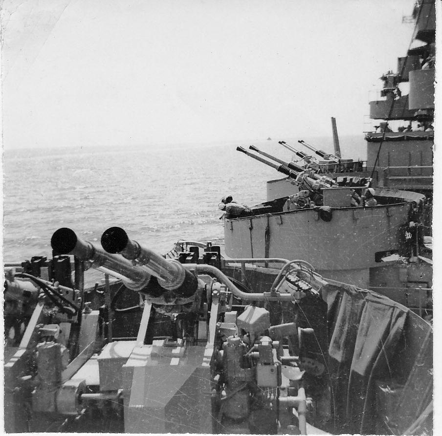 Looking forward: port quad 40mm mounts, 1951. From the N.A. "Stretch" Brown collection. Photo by N.A. "Stretch" Brown, Gunners Mate 3rd Class aboard Los Angeles. |