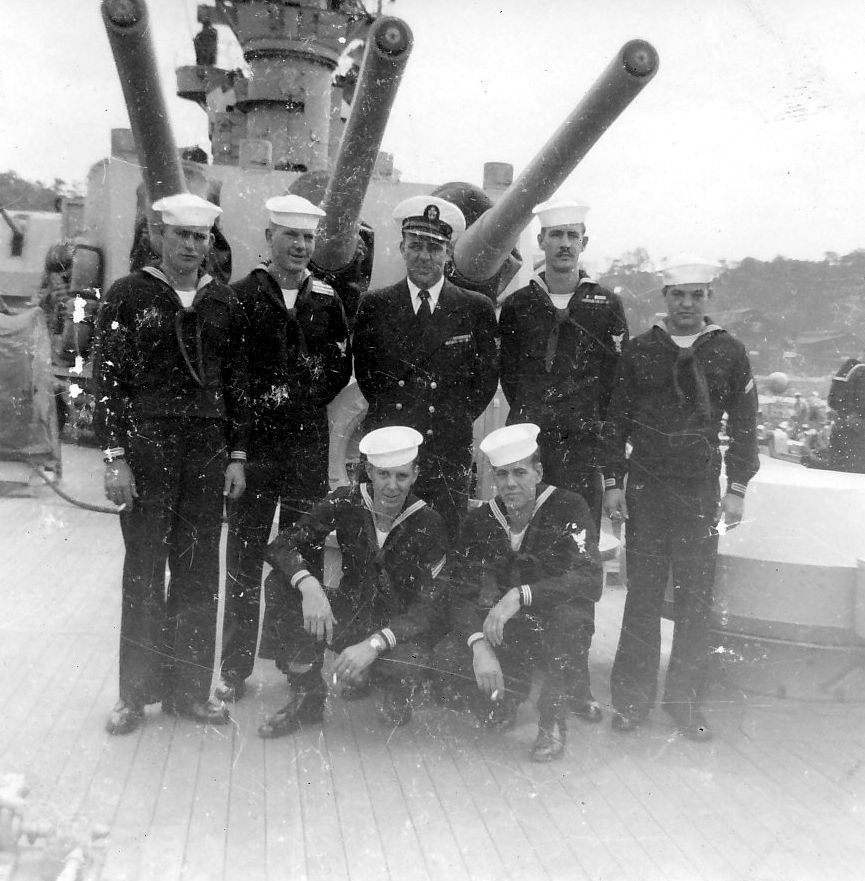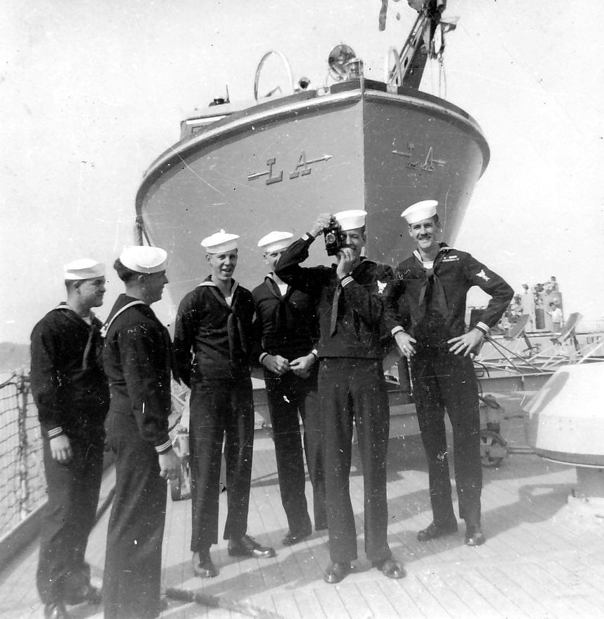 Captain's Gig and Gunners Mates, September 1951. From the N.A. "Stretch" Brown collection. L-R: Young, Taylor, Link, Squires, Basinett, Holland Photo by N.A. "Stretch" Brown, Gunners Mate 3rd Class aboard Los Angeles. |