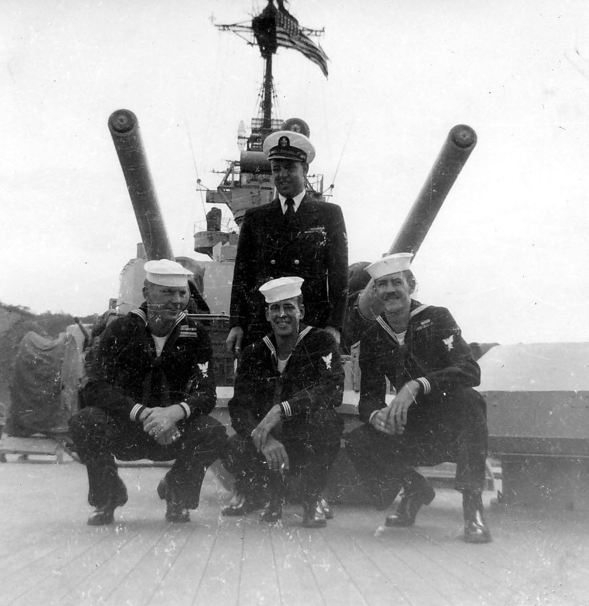 Chief Kohler and Gunners Mates, l-r: Squires, Basinett, Holland, Yokosuka, September 1951. From the N.A. "Stretch" Brown collection. Photo by N.A. "Stretch" Brown, Gunners Mate 3rd Class aboard Los Angeles. |