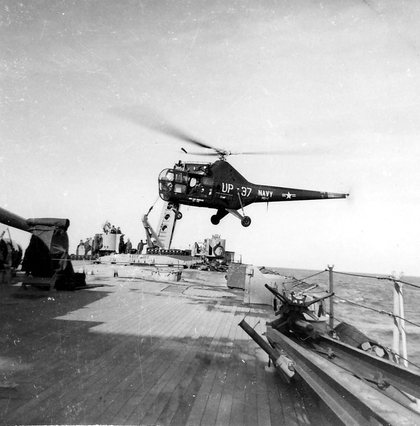 Helicopter landing on fantail, Korea, 1951. From the N.A. "Stretch" Brown collection. Photo by N.A. "Stretch" Brown, Gunners Mate 3rd Class aboard Los Angeles. |