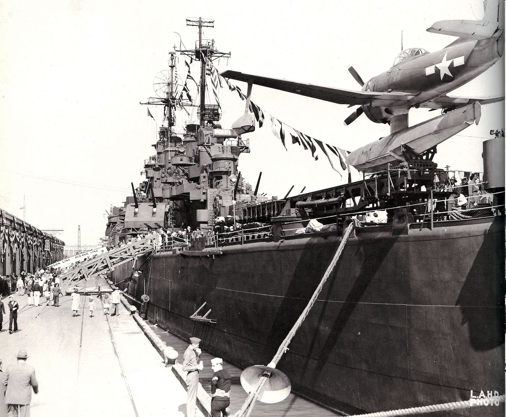 502k | USN photo taken on Navy Day, 27 October 1945, right after the end of WWII, Location is Berths 177-178, San Pedro Docks, Los Angeles Harbor. Note the civilians touring the decks. The aircraft loaded on the port catapult is a Curtiss SC-1, one of four assigned to the Los Angeles from Squadron V, Cruiser Squadron 21. Aircraft identification by William "Bill" Larkins. | Jim Geldert, USNI |