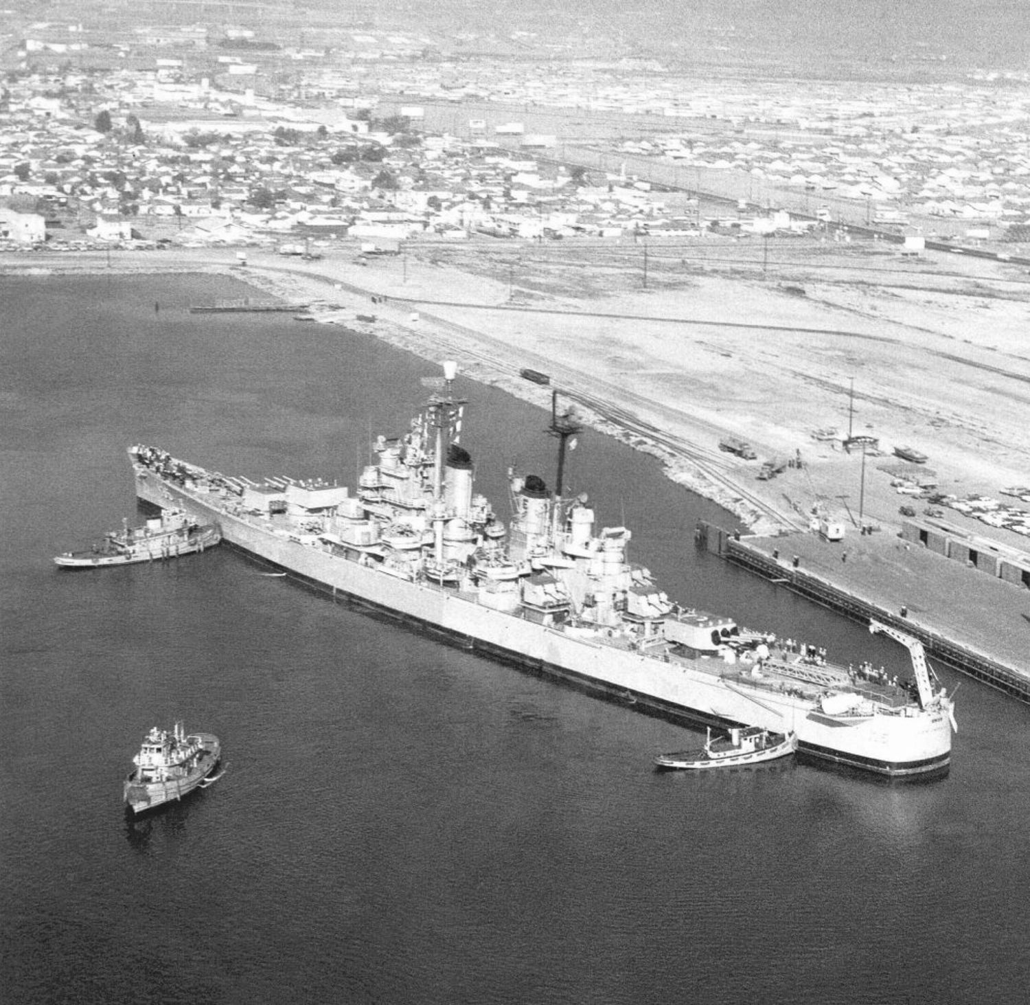USS Los Angeles (CA 135) berthed at Mare Island on 5 January 1952. She was under repair at the yard from 3 January to 28 April 1952. U.S. Navy Photo #11454-1-52 |