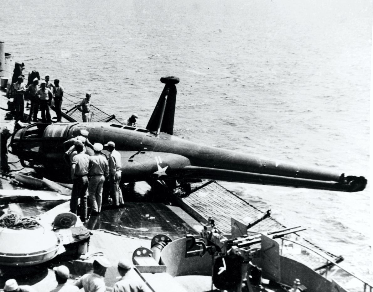 USS Los Angeles (CA 135) "West Coast Cruisers Capable of Nuclear Assault -- A Regulus I boils white smoke from booster charges as it roars away from its launcher aboard the heavy cruiser USS Los Angeles off San Diego. The launch, a routine evaluation 'shoot', was conducted during the time that 600 members of the Institute of Aeronautical Science were embarked aboard the attack carrier USS Ticonderoga (CVA 14), right. The demonstration, which included a 'Terrier' guided missile interception of the Regulus, power exhibition, carrier operations, and a HUK exercise, was highlighted by the Regulus launching. The Terrier was fired at the Regulus from the USS Norton Sound (AVM 1), background, on August 7." Text quoted from the original photo caption, which was released by Commander, Cruiser-Destroyer Force, U.S. Pacific Fleet, on 9 August 1957. Official U.S. Navy Photograph, from the collections of the Naval Historical Center #NH 97391. |