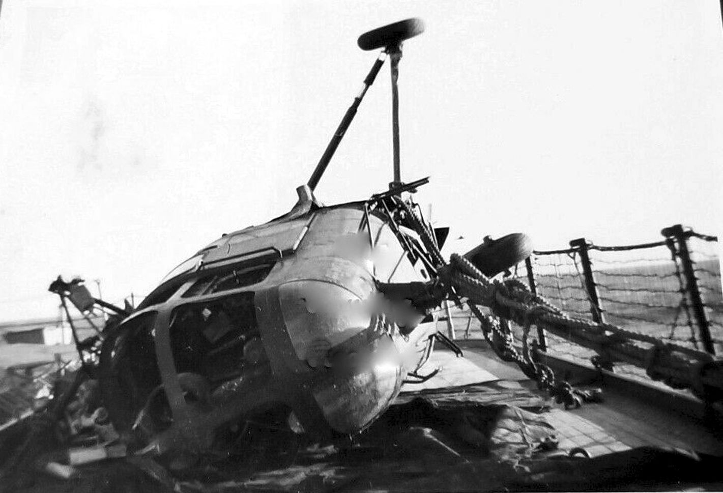 177k | On board USS Los Angeles (CA 135) after a Sikorski H03S-1 Helicopter crashed while landing on the ship with Rear Admiral Arleigh A. Burke, Commander Cruiser Division Five, and Lieutenant General James A. Van Fleet, Commanding General, Eighth Army, aboard, circa June-July 1951. No one was injured in the accident. Donation of Admiral Arleigh A. Burke, USN (Retired), 1969. U.S. Naval History and Heritage Command Photograph #NH 66526. |
