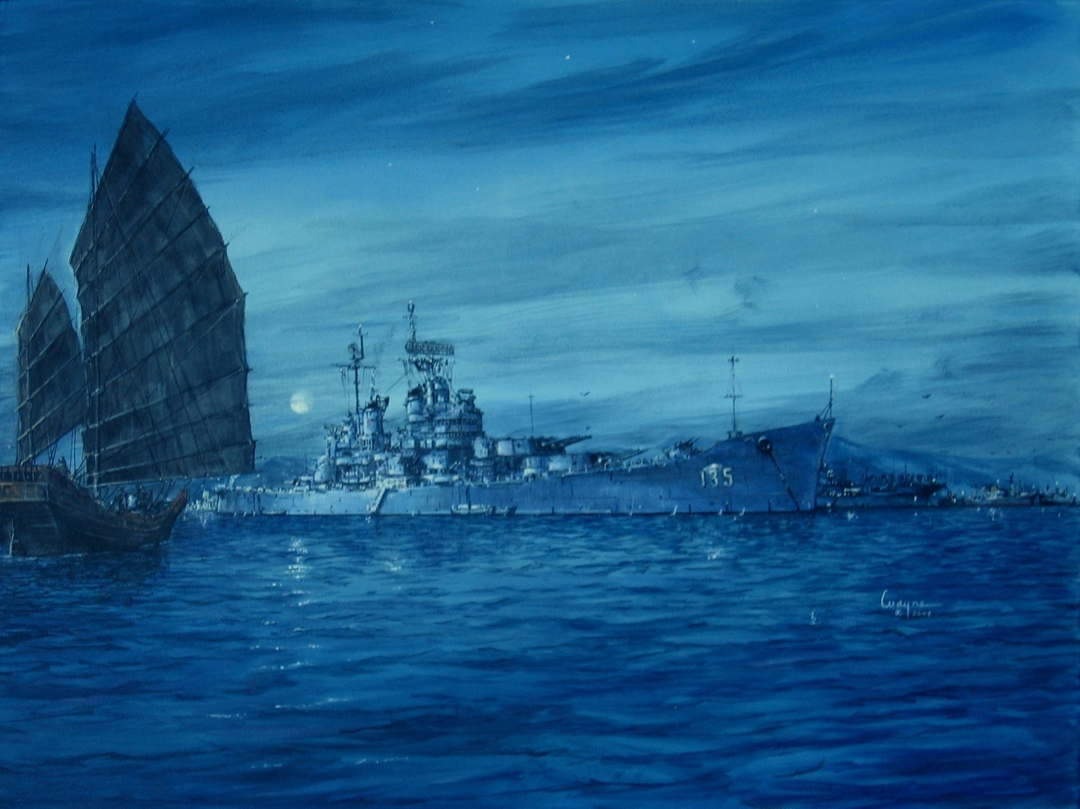567k | A painting of USS Los Angeles (CA 135) at anchor at twilight in Hong Kong Harbor 1962. The title of the piece is "China Moon" by artist Wayne Scarpaci. | Wayne Scarpaci |