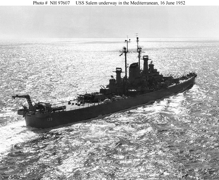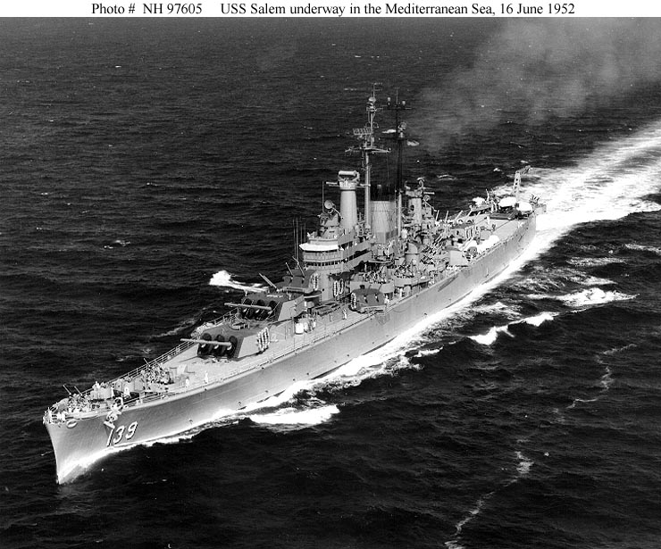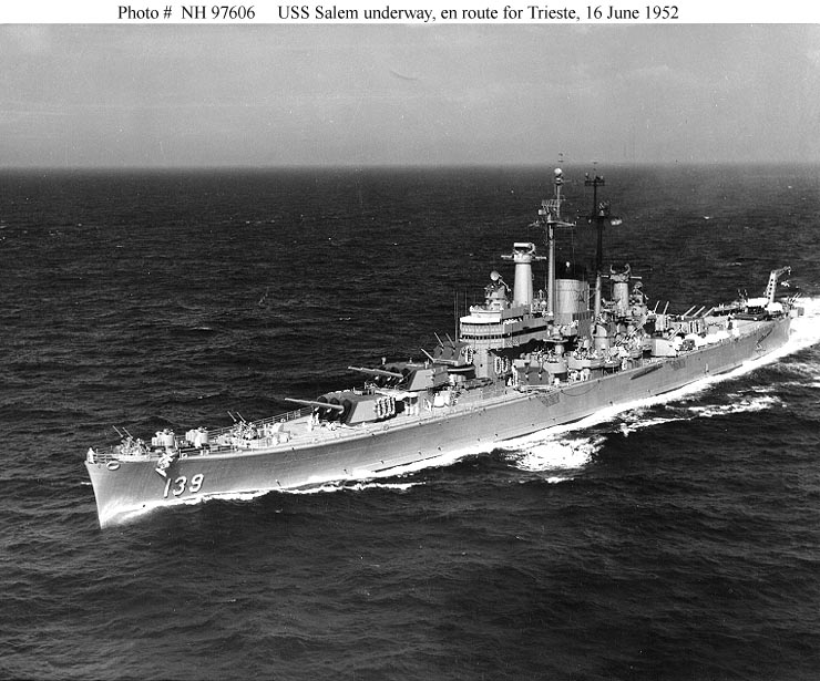 USS Salem (CA 139) Underway in the Mediterranean Sea, en route to Trieste, on 16 June 1952. Official U.S. Navy Photograph, from the collections of the Naval Historical Center #NH 97605. |