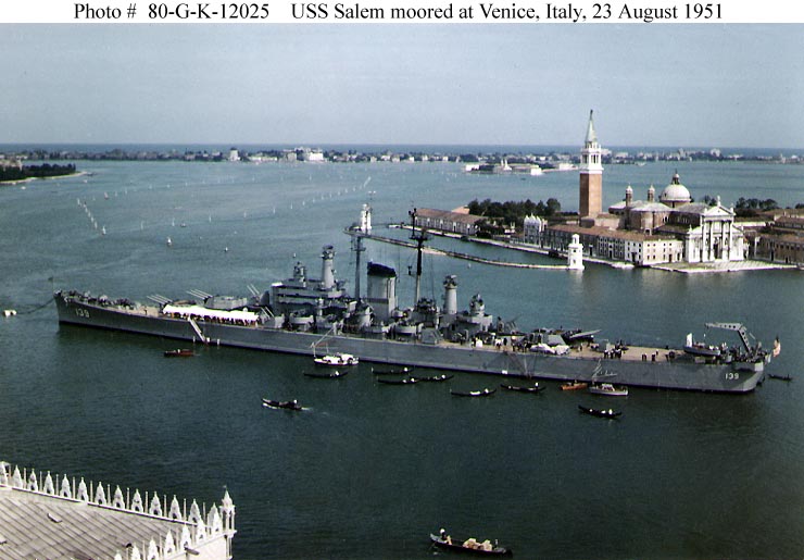 USS Salem (CA 139) moored in the Canal della Guidecca, during a visit to Venice, Italy, on 23 August 1951. Salem was then flagship of the Sixth Fleet. Note decorated awning rigged forward, probably for entertaining visiting dignitaries. Official U.S. Navy Photograph, now in the collections of the National Archives #80-G-K-12025. |