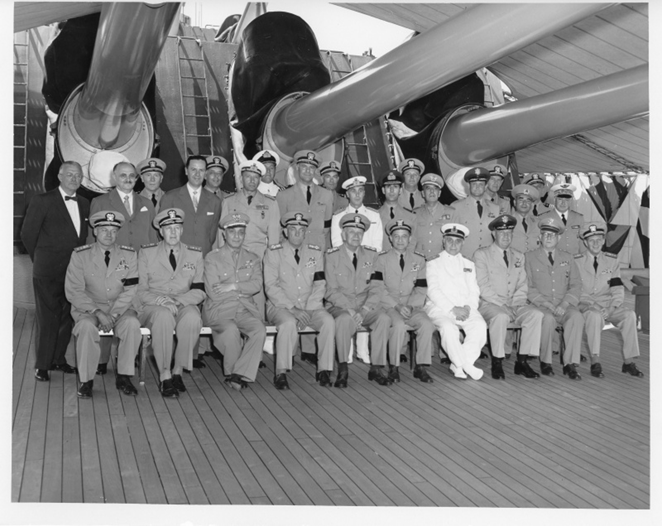 556k | United States Navy officers and other officials pose for a photograph on the deck of the USS Salem, 29 January 1956. First row, left to right: Sears; Ekstrom; Cassino; Briscoe; Admiral William M. Fechteler, United States Navy, Commander-in-Chief, Supreme Headquarters Allied Powers Europe (SHAPE); Felt; Vice Admiral Giuseppe Lubrano, Italian Navy; Lieutenant Patrick W. Timberlake, United States Air Force; Major General Frank N. Roberts, United States Army; Rear Admiral Elmer E. Yeomans, United States Navy. Second row, left to right: Henderson; two unidentified men; Unia; Lodge; Fiori; Ulantoussis; General Meloni, Italian Army; Young; Brigadier General Cemal Aydinalp, Turkish Army; Bezy. Third row, left to right: Brown; Roby; Hart; unidentified; Noussle; Freeman; and unidentified. |
