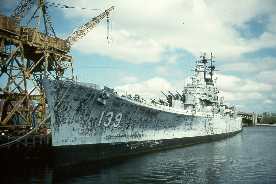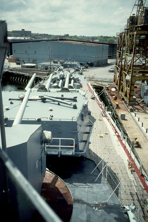 94k | Retired U.S. Navy ships laid up in the reserve basin of the Philadelphia Naval Shipyard, Pennsylvania, in 1995. Identifiable are the frigate USS Edward McDonnell (FF 1043) in the foreground, and the heavy cruisers USS Des Moines (CA 134) and USS Salem (CA 139) in the background. A Belknap-class cruiser and two Farragut-class guided missile destroyers are moored in front of Salem. 1 January 1995. Courtesy Jet Lowe. U.S. Historic American Engineering Record, U.S. Library of Congress Prints and Photographs HAER PA,51-PHILA,709W--4. |