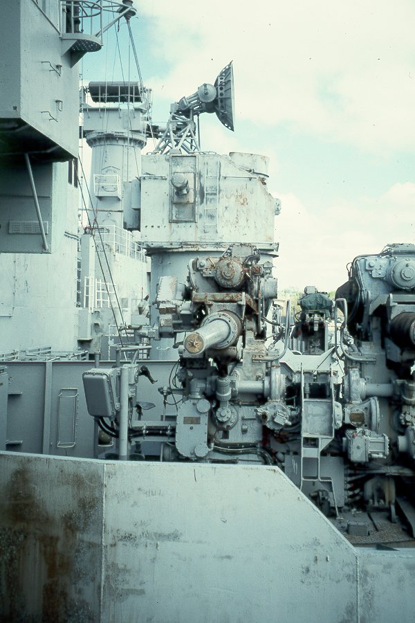 151k | Port view of the Bridge of USS Salem taken about 22 September 1954. Note that at this time, the only ribbon mounted on the bridge is the occupation ribbon. Note also the "Bite" taken out of the lower bridge rail to allow the 3" 50 cal. to swing full circle. Firing Cutout Cams inside the gun mount prevented shooting while pointing in an unsafe direction. | Larry Bohn | |