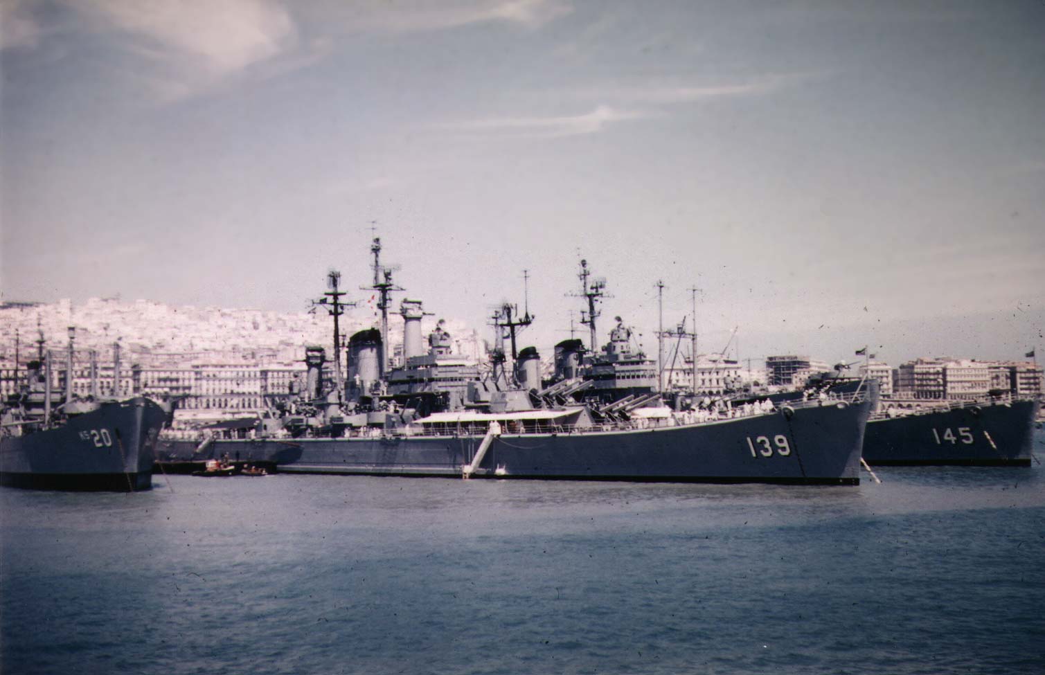 116k | Starboard bow view in Algiers, Algeria on 20 May 1954. USS Mercury (AKS 20) to Starboard. USS Roanoke (CA 145) to Port. Almost hidden behind Roanoke is USS Tidewater (AD 31). | Larry Bohn | |