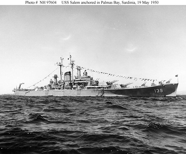 USS Salem (CA 139) At anchor in Palmas Bay, Sardinia, on 19 May 1950, two days after she became flagship of the Sixth Fleet. She is dressed with flags and flies the three-star flag of Commander, Sixth Fleet, from her foremast. Official U.S. Navy Photograph, from the collections of the Naval Historical Center #NH 97604. |