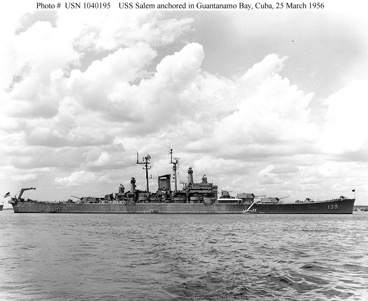 USS Salem (CA 139) Anchored in Guantanamo Bay, Cuba, 25 March 1956. The cruiser was then working up for her final tour as flagship of the Sixth Fleet in the Mediterranean Sea. Official U.S. Navy Photograph, now in the collections of the National Archives #USN 1040195. |