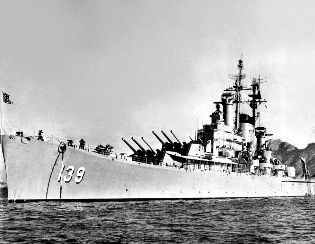 112k | USS Salem (CA 139) at anchor in Naples, Italy, as seen from USS Baltimore (CA 68) in 1952. | George Panos Ex QMS 2/C |