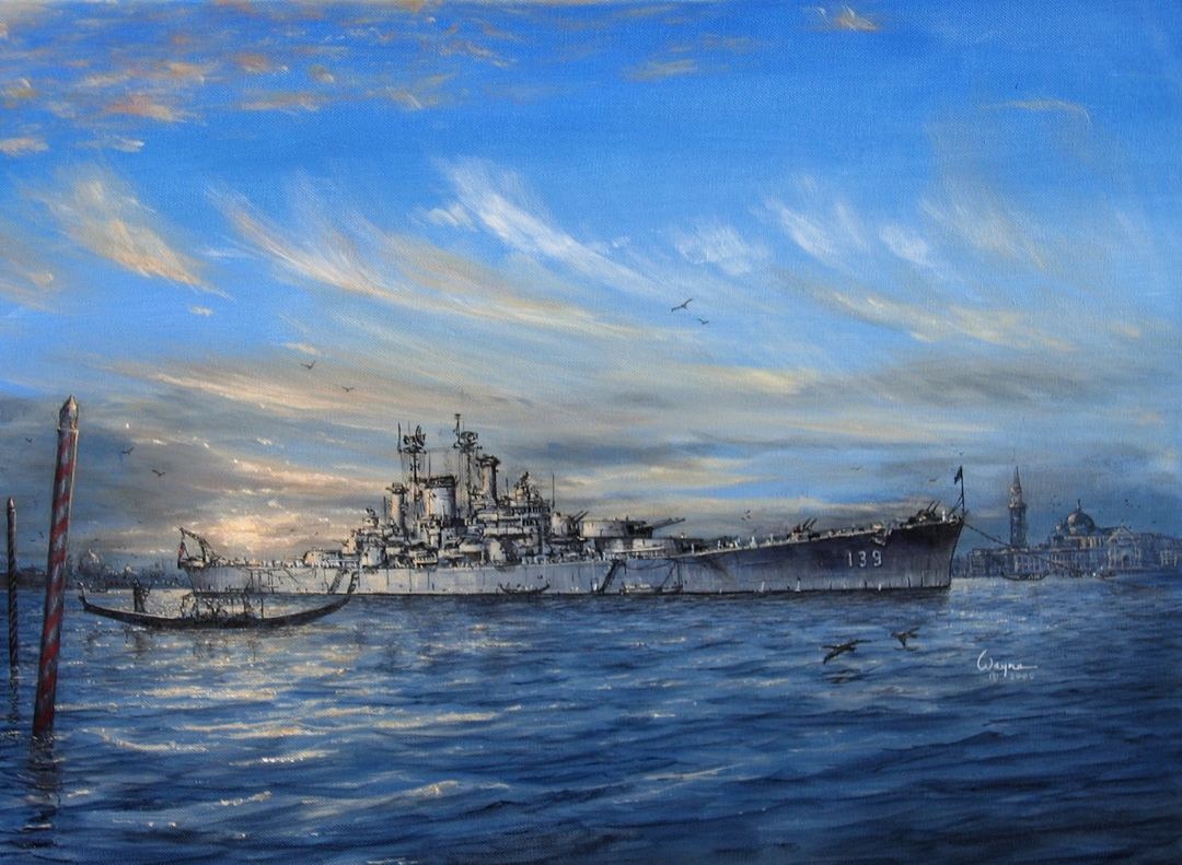 698k | A painting of USS Salem (CA 139) at anchor in Venice, Italy, circa 1958. The title of the piece is "Evening in Venice" by artist Wayne Scarpaci. | Wayne Scarpaci | |
