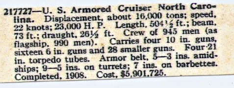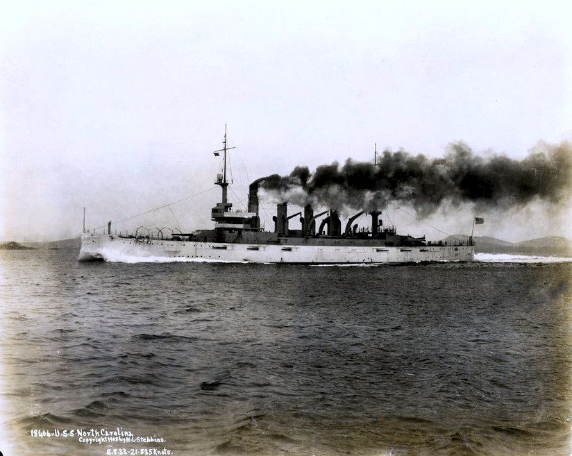 NR | BIG CRUISER LAUNCHED The North Carolina (ACR 12) Takes the Water at Newport News. The new and powerful armored cruiser North Carolina was successfully launched at 11:22 o'clock this morning from the yards of her builders, the Newport News Shipbuilding and Drydock Company, in the presence of ten thousand persons. Miss Rebekah Williams Glenn, daughter of Governor R. B. Glenn of North Carolina, named the vessel. Governor Glenn was present with his staff and an escort of prominent North Carolinians. The launching was attended by Rear Admiral Berry, amid great applause. The North Carolina is advanced about 58 percent toward completion, further than any other armorclad at the time of launching. | Image and text provided by Library of Congress, Washington, DC. Photo from New-York Tribune. [volume] (New York [N.Y.]) 1866-1924, 07 October 1906, Image 4, via chroniclingamerica.loc.gov. | |