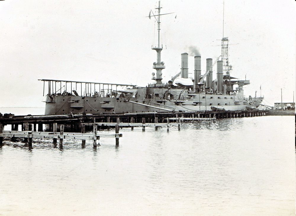 429k | Montana (ACR 13) (left) and North Carolina (ACR 12) (right), moored at Norfolk Navy Yard on 26 October 1908. Note that Montana is still painted in her original White and Buff colors while the North Carolina has reverted back to Gray, as is the rest of the fleet. Historic Norfolk Navy Yard Glass Plate Collection, #607 |