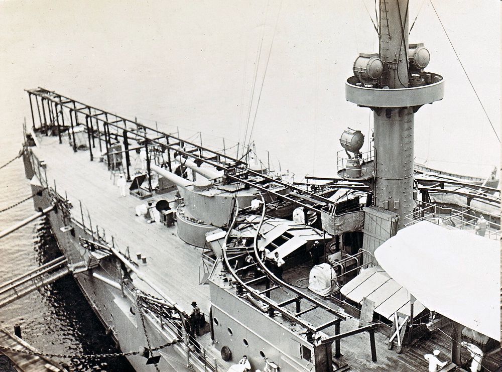 view of the cruiser's armament and the catapult configuration on the ship.