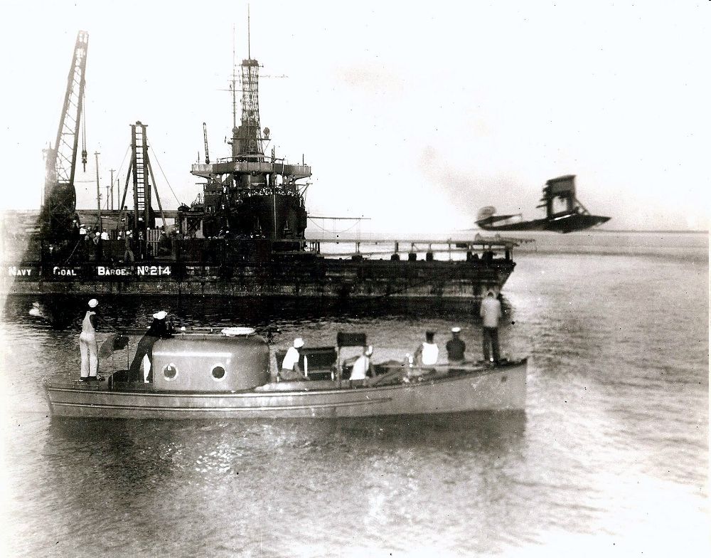 Curtiss F Boat (AB-2) view taken 5 November 1915 at Pensacola FL during the first launch of a plane from a ship while underway. The pilot was Lieutenant Commander H.C. Mustin, USN. Note boat standing by in foreground to render assistance if needed. USNHC Photo NH-83910 via history.navy.mil |