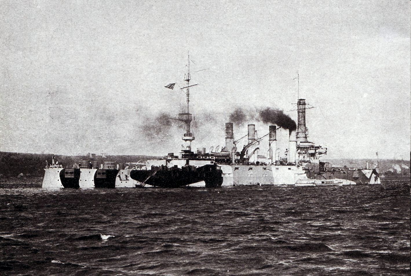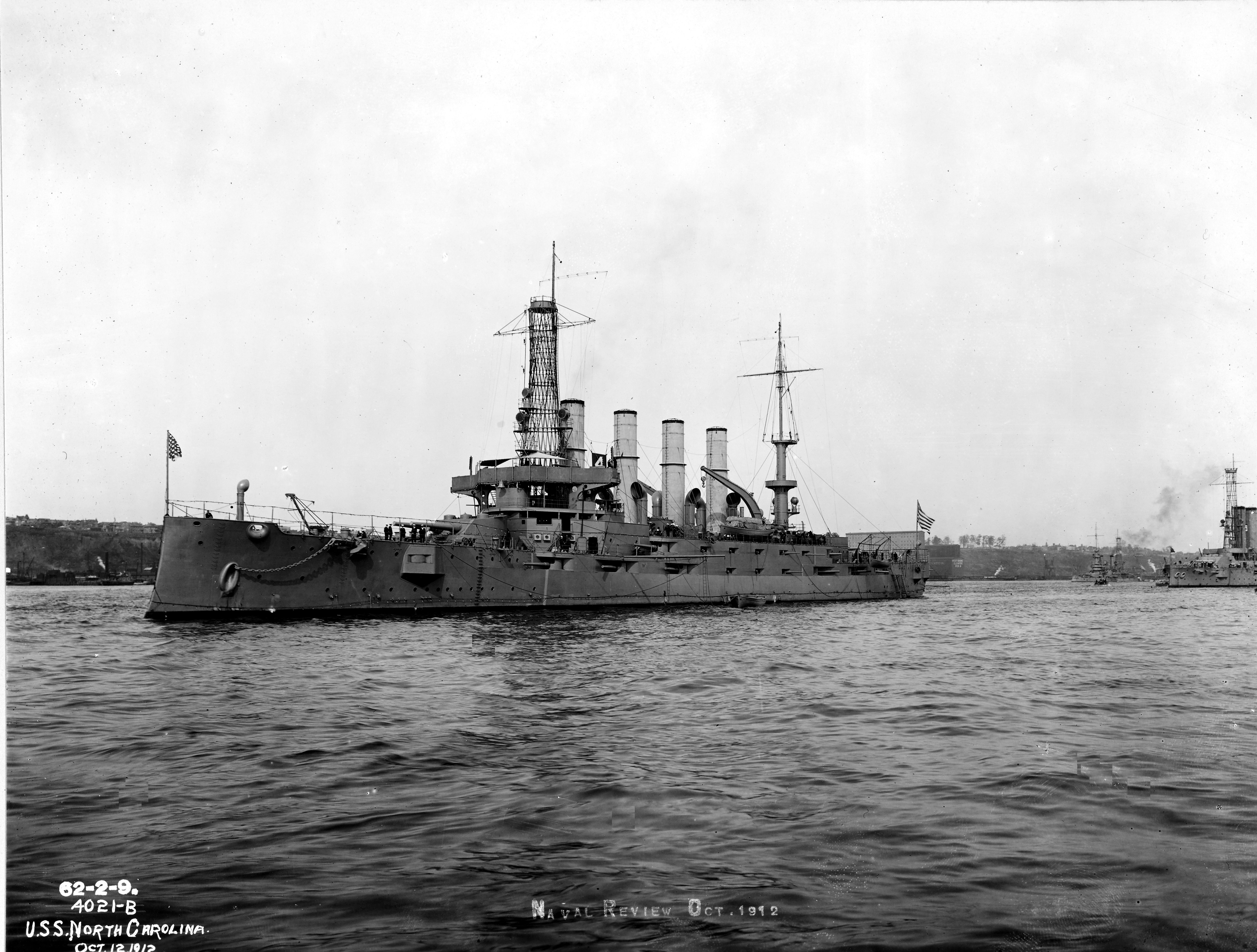 2.2m | Port bow view while at anchor 12 October 1912 on the Hudson River during the annual Naval Review. Note the identification number ("4") suspended between the first and second stack. The unidentified battleship behind her has the number "5" suspended between her stacks. These numbers would be for the spectators to identify the ships. National Archives item #165-WW-335D-4 |