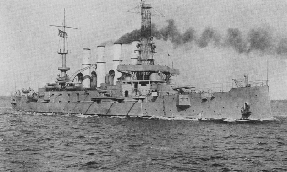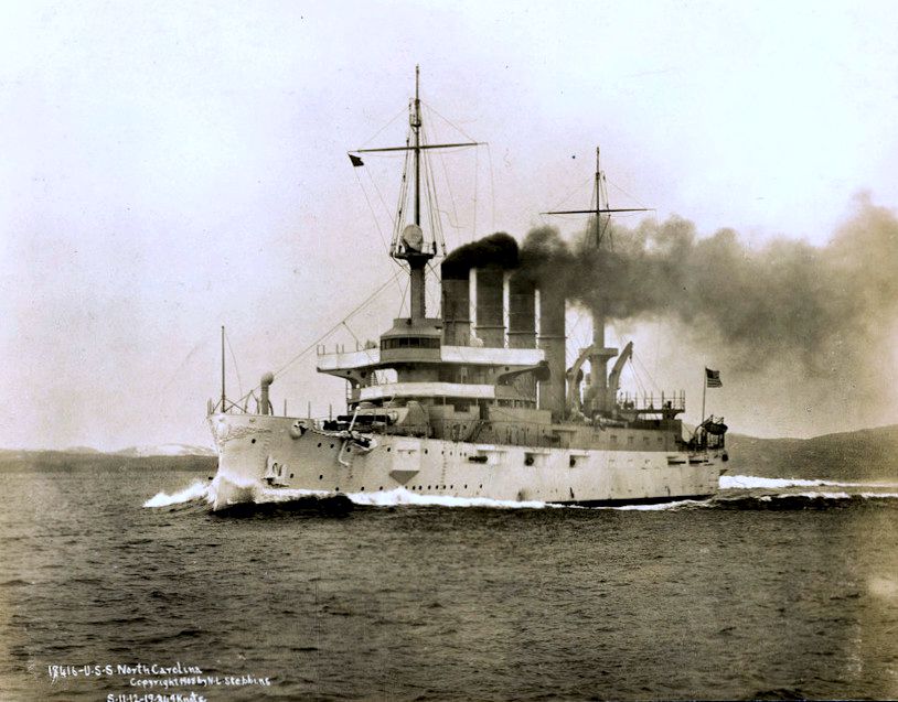 2.83k | Starboard bow view of North Carolina (ACR 12) with the mainmast of Montana (ACR 13). The ship between is Minnesota (BB 22) either as commissioned or awaiting commissioning, early 1907. | Photo LC-DIG-det-4a23110 courtesy of catalog.archives.gov | |