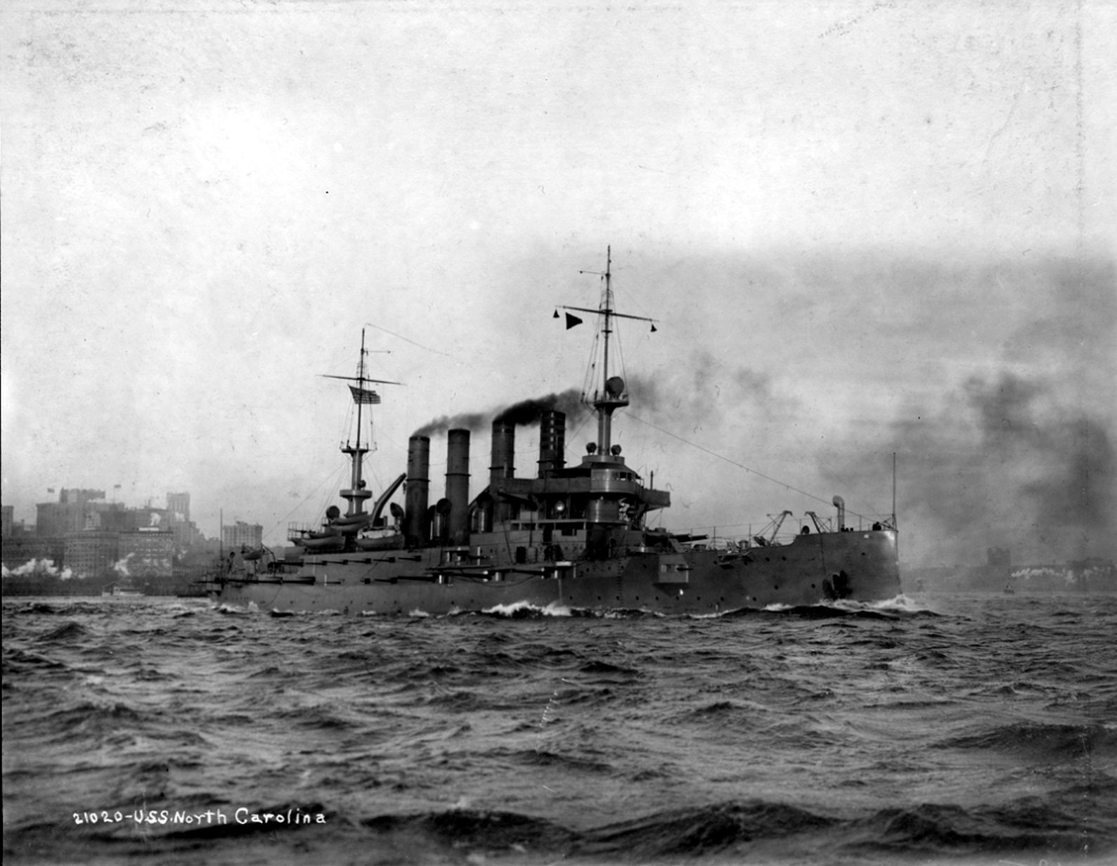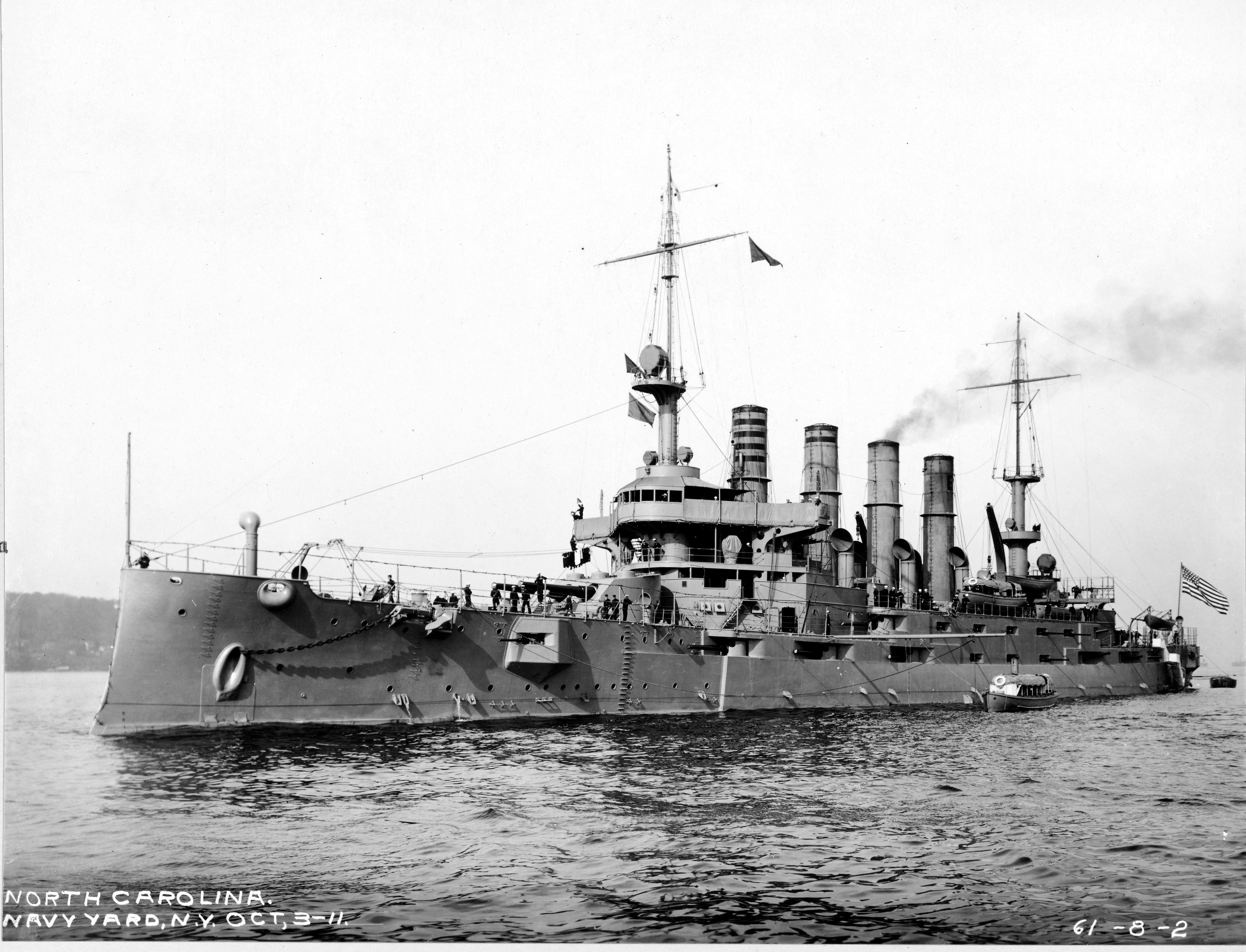 115k | Port side view of North Carolina (ACR 12) on 6 January 1908. Built at Newport News Ship Building and Drydock Company, the North Carolina will be commissioned on 7 May. Historic New England Nathaniel L. Stebbins Collection, Photo No. PC047.02.4500.18406 |