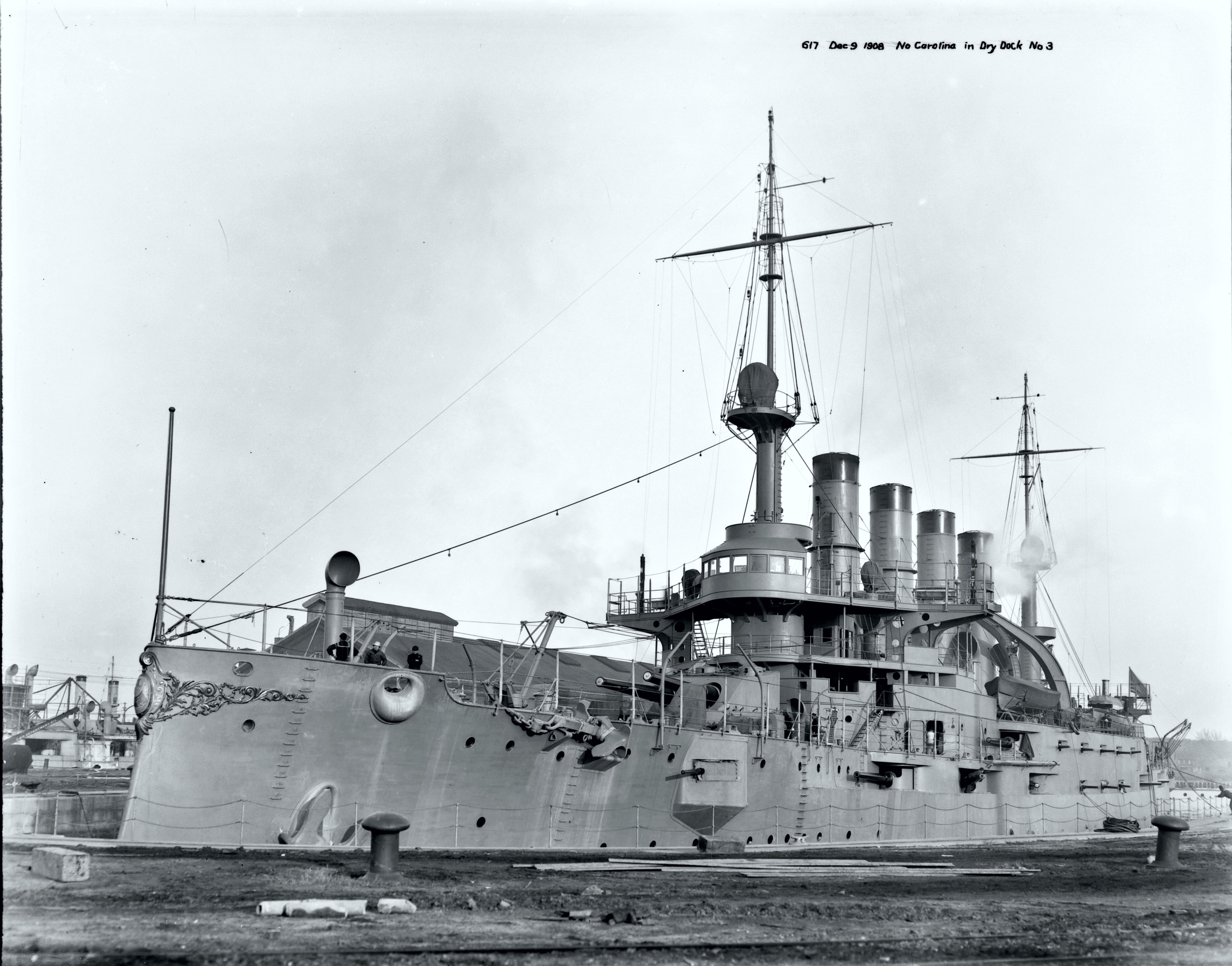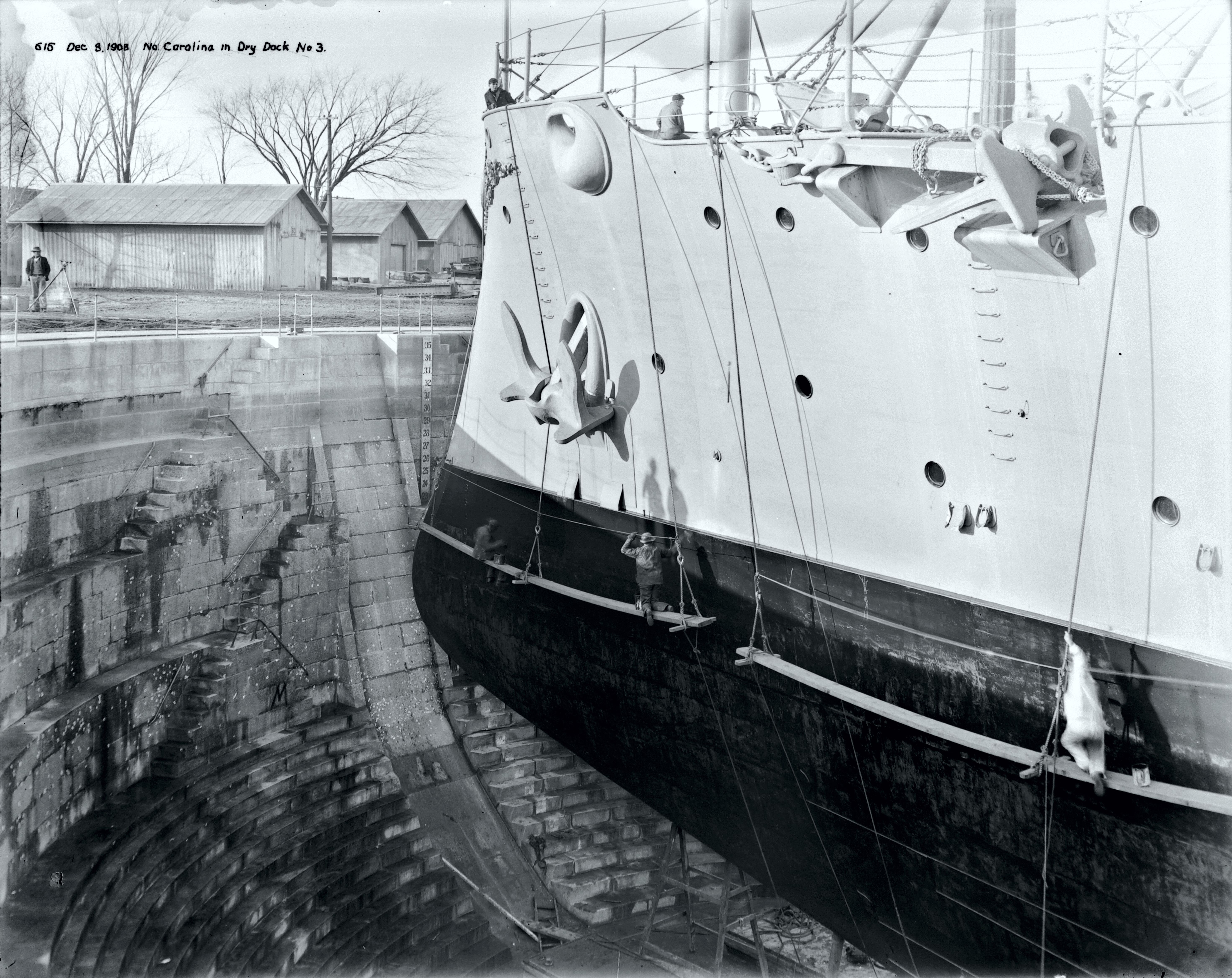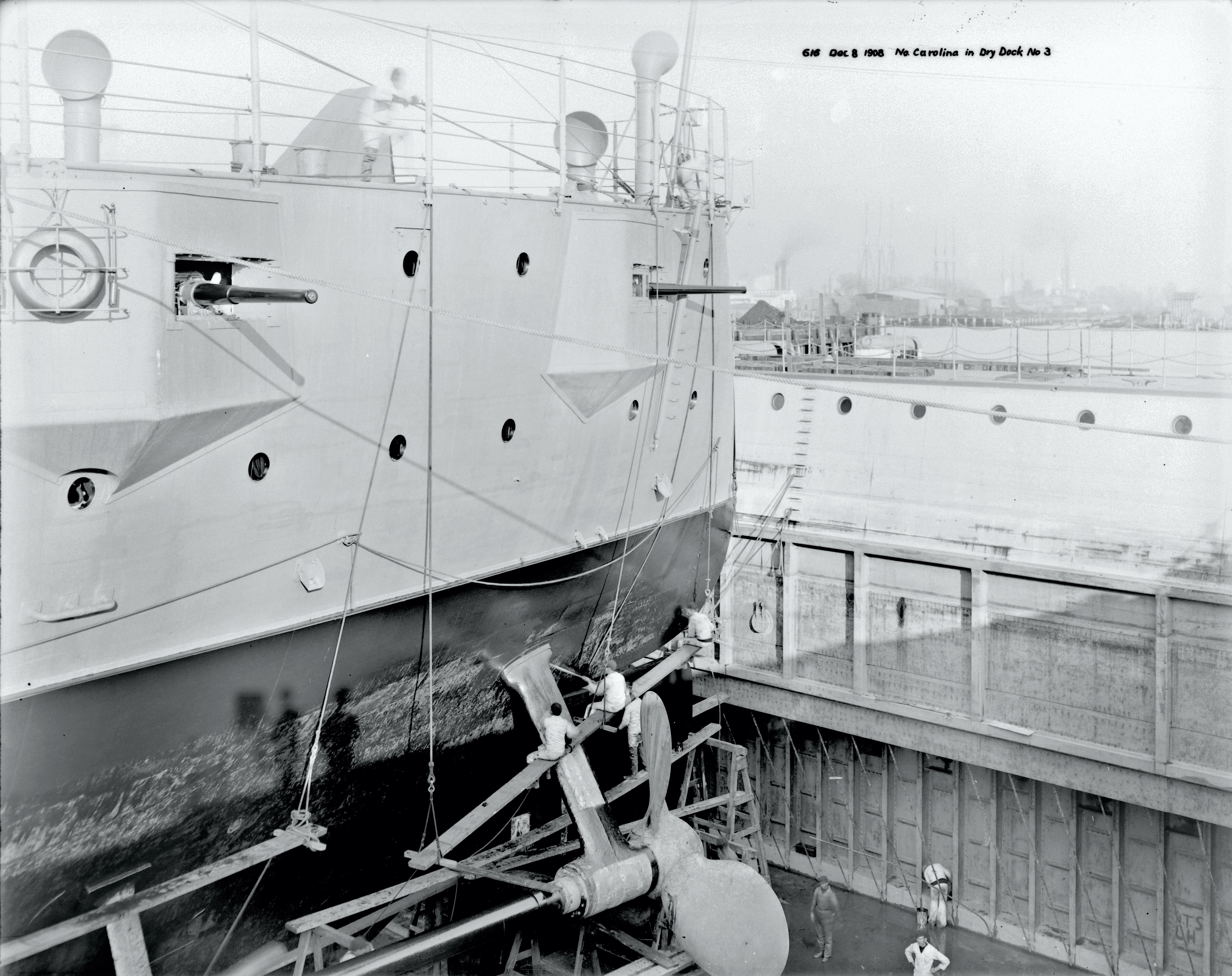 2.93m | Port bow view of North Carolina while in Dry Dock #3 on 9 December 1908. By the look of the ship, they are preparing to refloat her as there is no planking or other maintenance equipment visible. Historic Norfolk Navy Yard Glass Plate Collection, #617 |