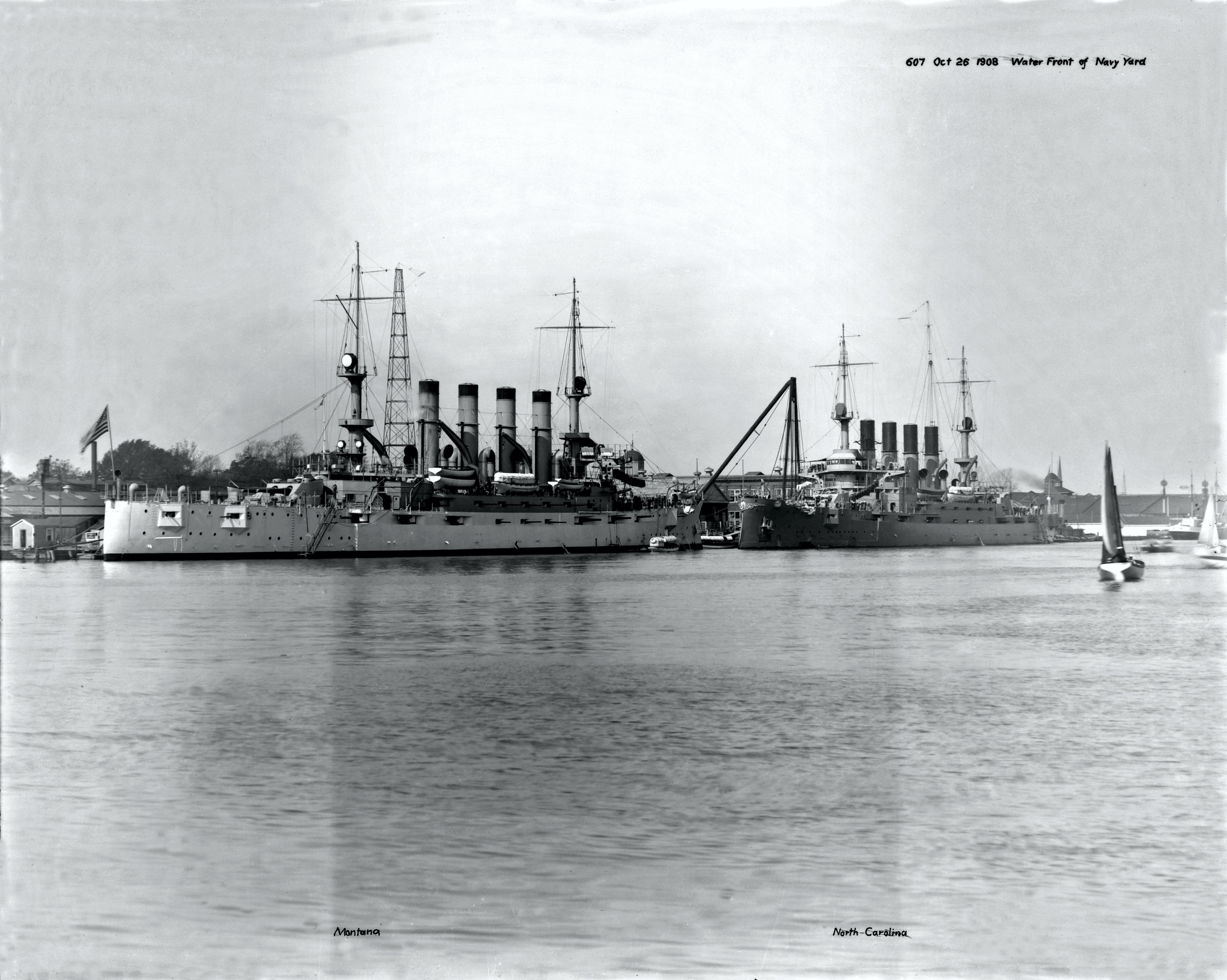 3.25m | Montana (ACR !3) (left) and North Carolina (ACR 12) (right), moored at Norfolk Navy Yard on 26 October 1908. Note that Montana is still painted in her original White and Buff colors while the North Carolina has reverted back to Gray, as is the rest of the fleet. Historic Norfolk Navy Yard Glass Plate Collection, #607 |
