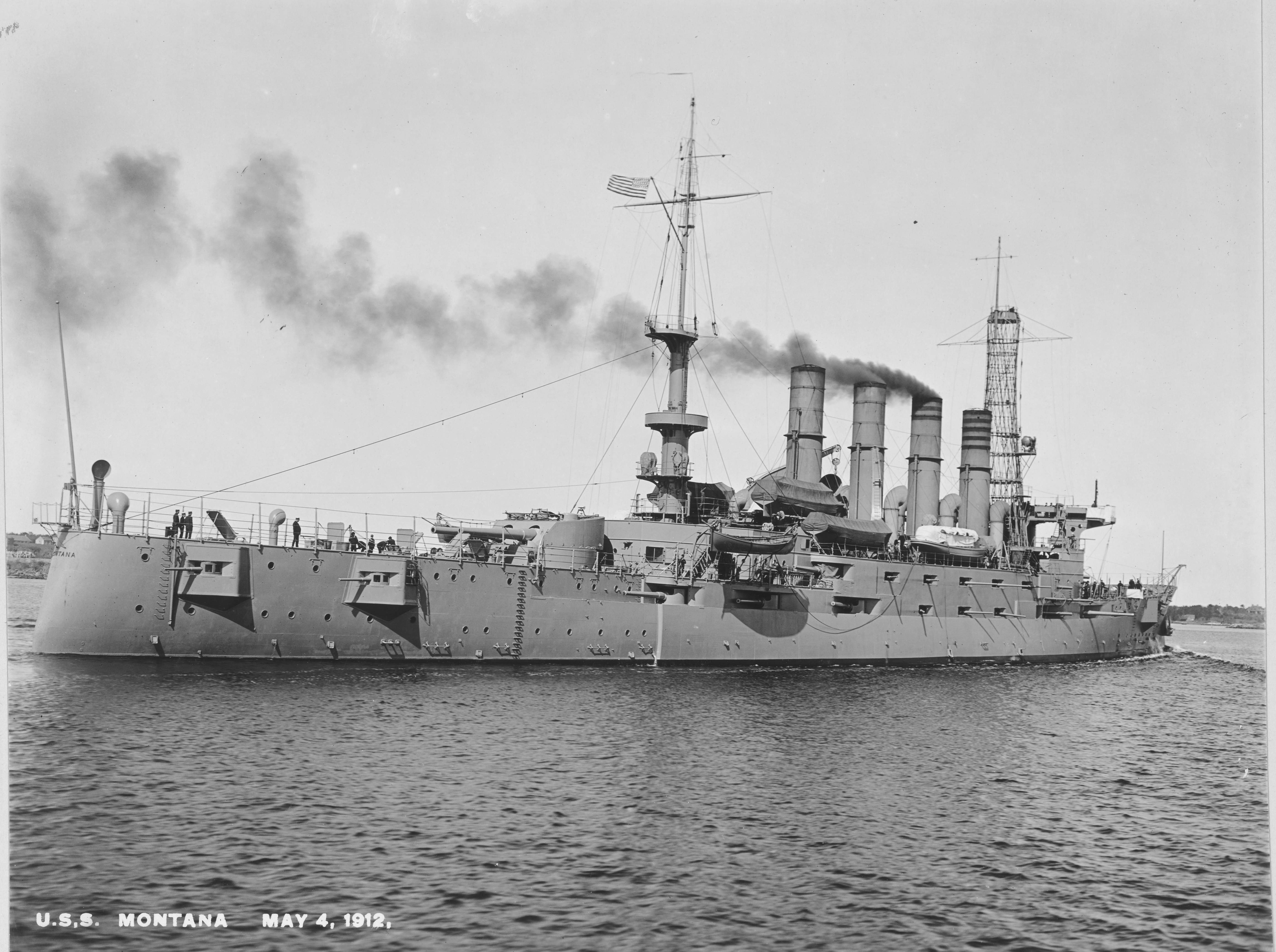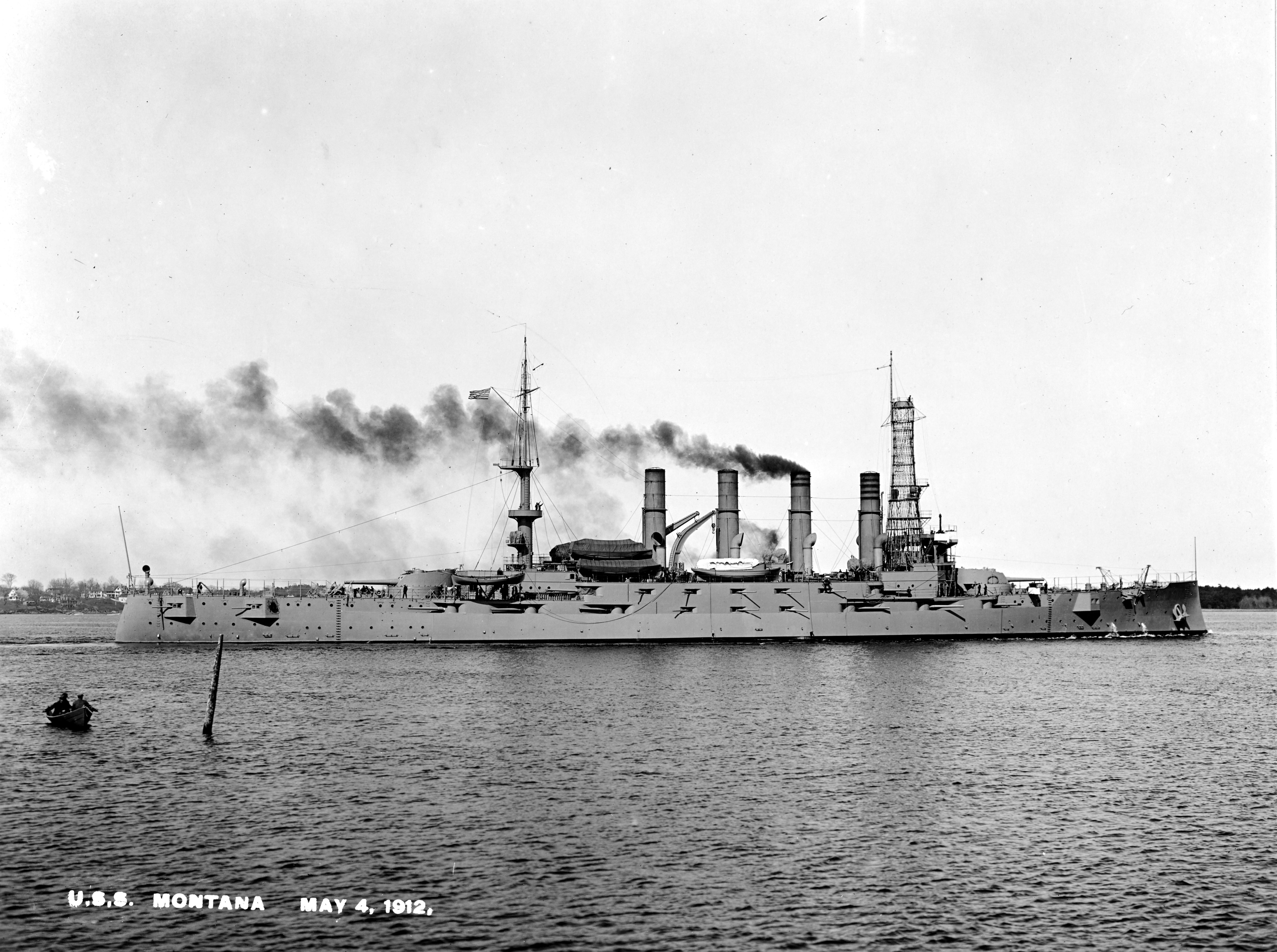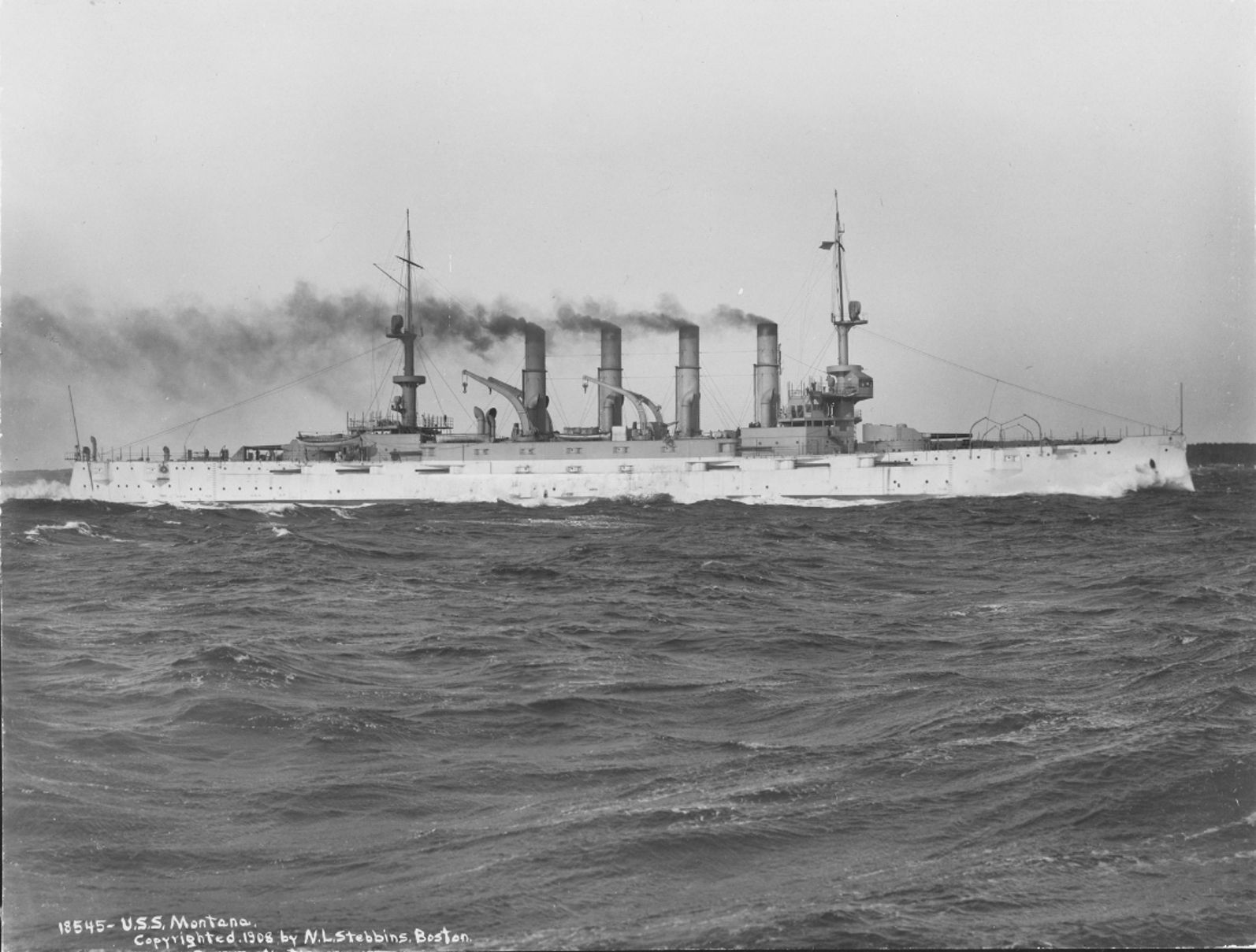 12k | Starboard broadside of the Montana (ACR !3) underway ca. 1912-1915. Location is unknown (caption updated by Evan Dwyer). Library of Congress, LC-D4-22806 |