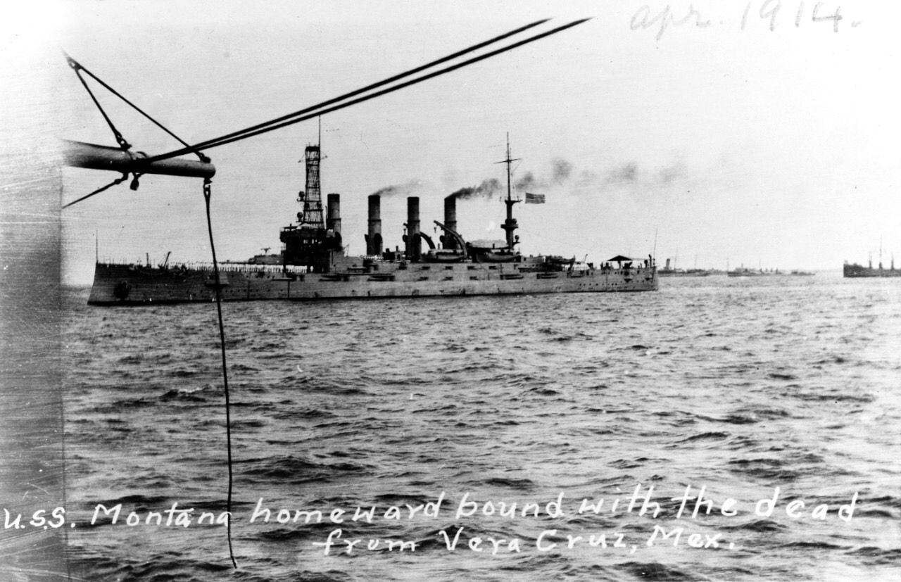 191k | Montana (ACR !3) homeward bound with the dead from Vera Cruz, Mexico in April, 1914. Courtesy of Chaplain C.H. Dickens. Source: Naval History and Heritage Command, Photo No. NH 45988. |