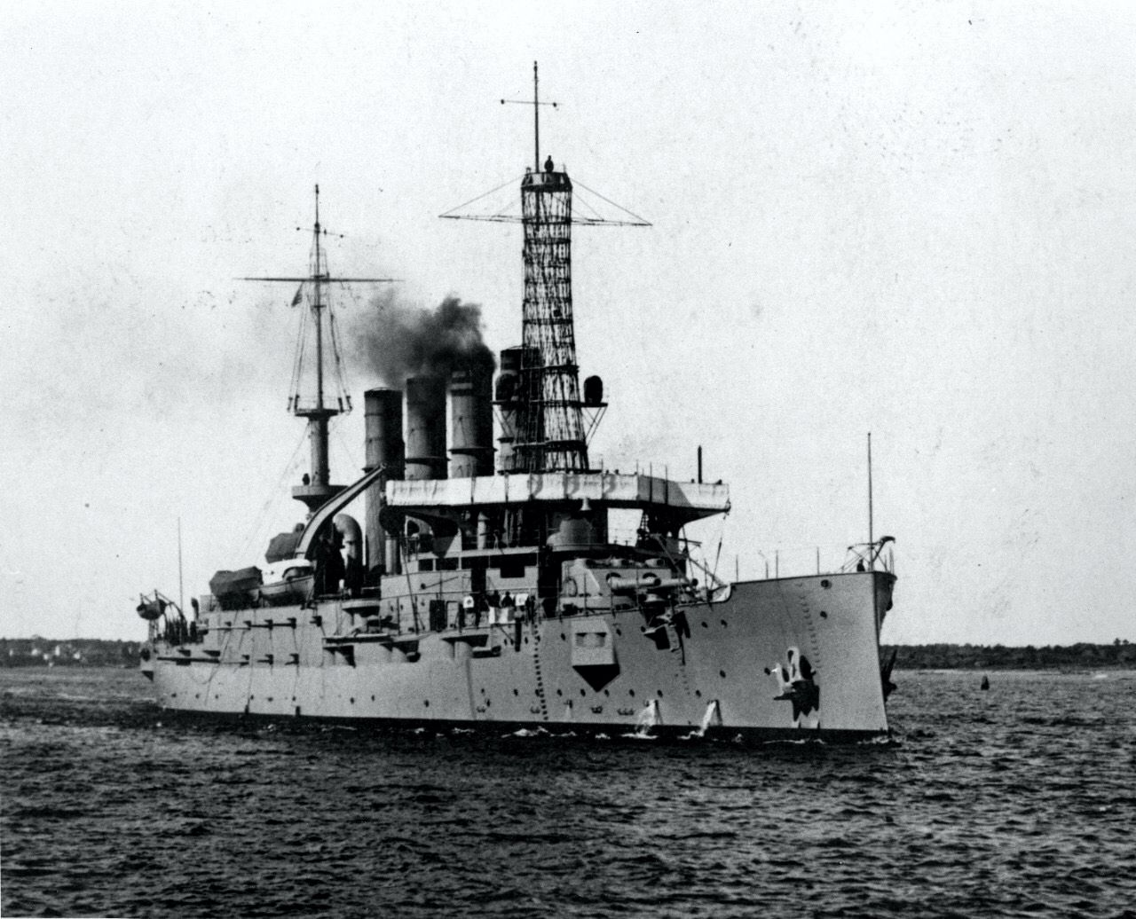 Montana (ACR 13) sails along in a pastoral scene, 1908-15. |