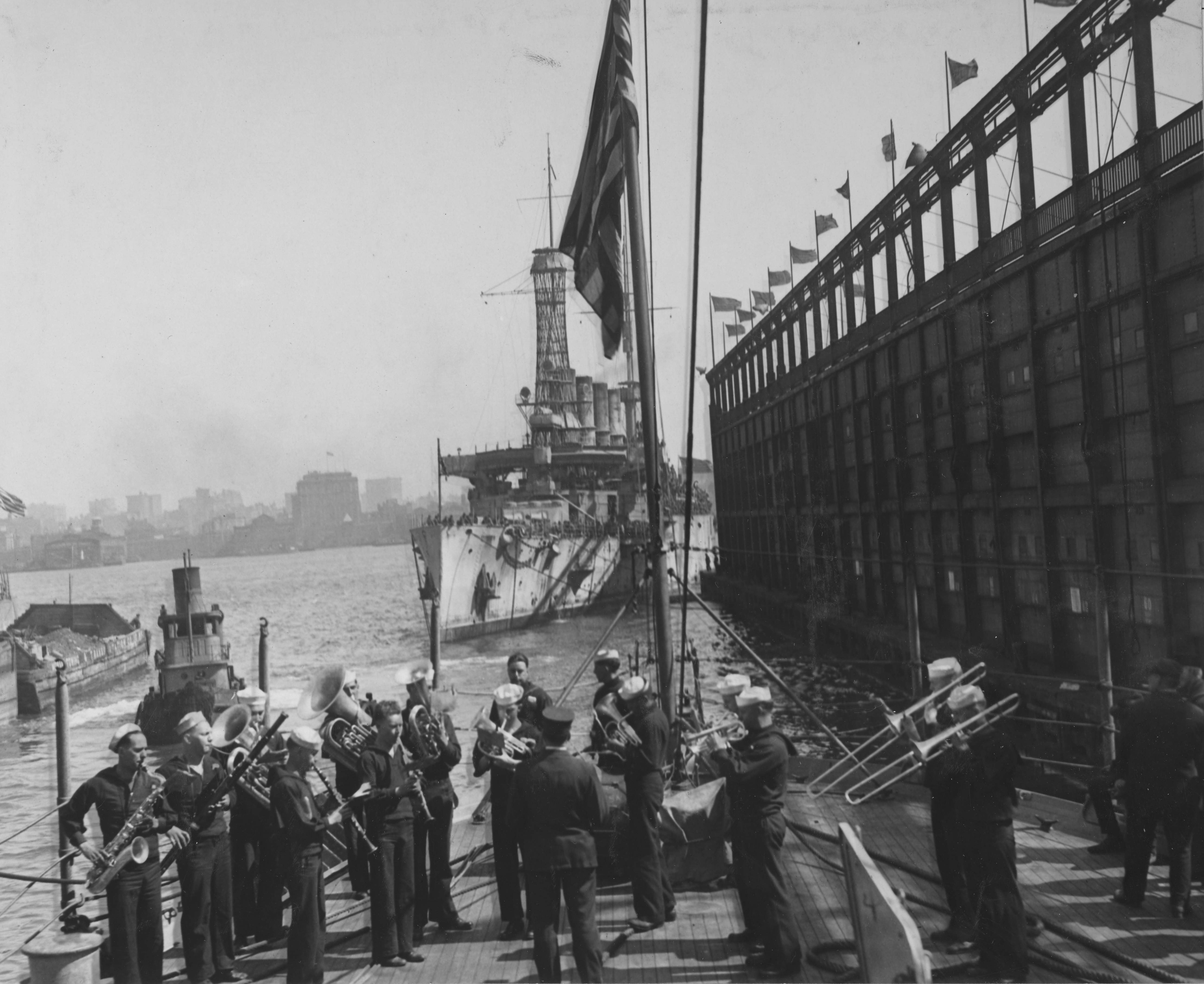 Band playing on cruiser Charleston (Cruiser No. 22) greeting Montana as she docks with troops from France, 1919. |