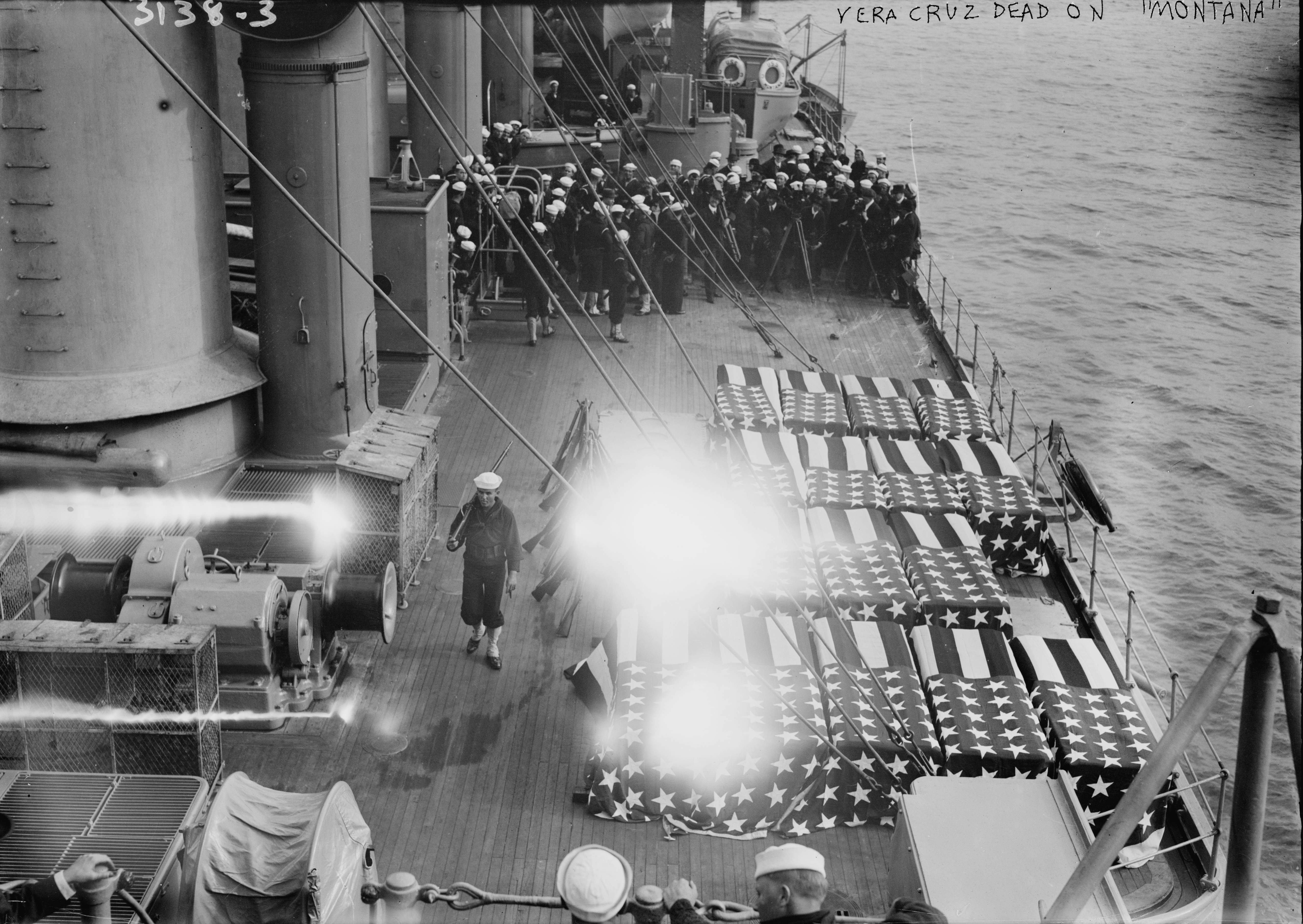 ![]() acr1323 | 1.56k | Flag draped caskets on the Montana (ACR-13) at Pier A, New York City before the National Memorial Service on May 11, 1914, in honor of the seamen and marines who were killed in Veracruz, Mexico during the Mexican Revolution. (Source: Flickr Commons project, 2011 and New York Times, 11 May 1914 | Photo # LC-USZ62-49085 courtesy of loc.gov | |