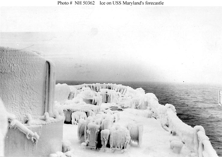 784k | Frozen spray ice coats the ship's forward eight-inch guns, forecastle and superstructure after operations at sea, circa 1918 Photo by Underwood & Underwood National Archives Identifier: 45513866 Local Identifier: 165-WW-339A-003. Photo courtesy of catalog.archives.gov |