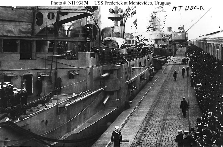 187k | Frederick (ACR-8) (right) is moored alongside the battleship Rhode Island (BB 17) (left) at Mare Island in 1922. Both ships are decommissioned. | Darryl Baker | |