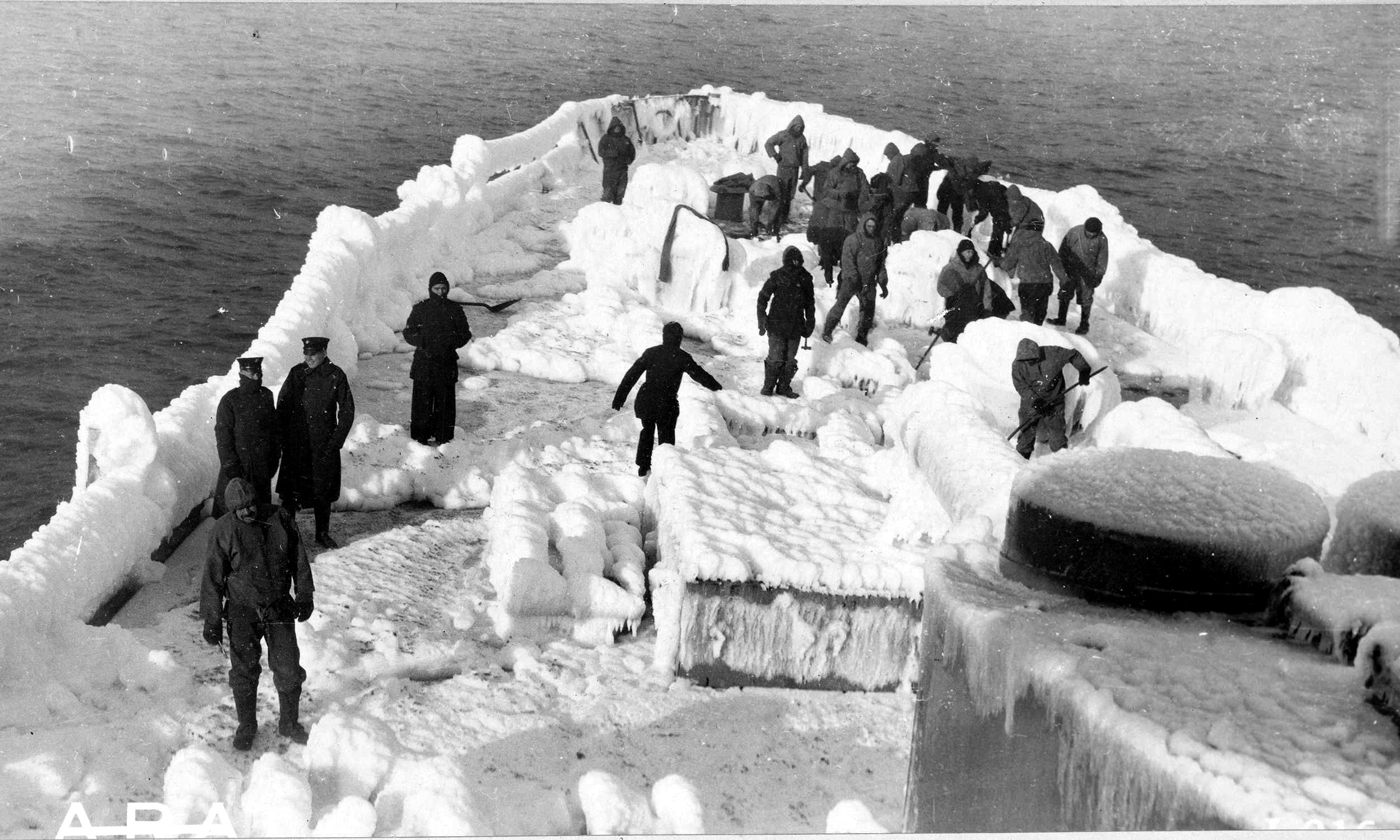 461k | This most remarkable photograph was taken while plowing the high seas. The deck is covered with ice and snow and the men are clearing it off. The guns can be seen projecting from the turrets and they too are covered with ice and snow, 18 March 1918. Photo by Underwood & Underwood National Archives Identifier: 45512619 Local Identifier: 165-WW-334A-099. Photo courtesy of catalog.archives.gov |