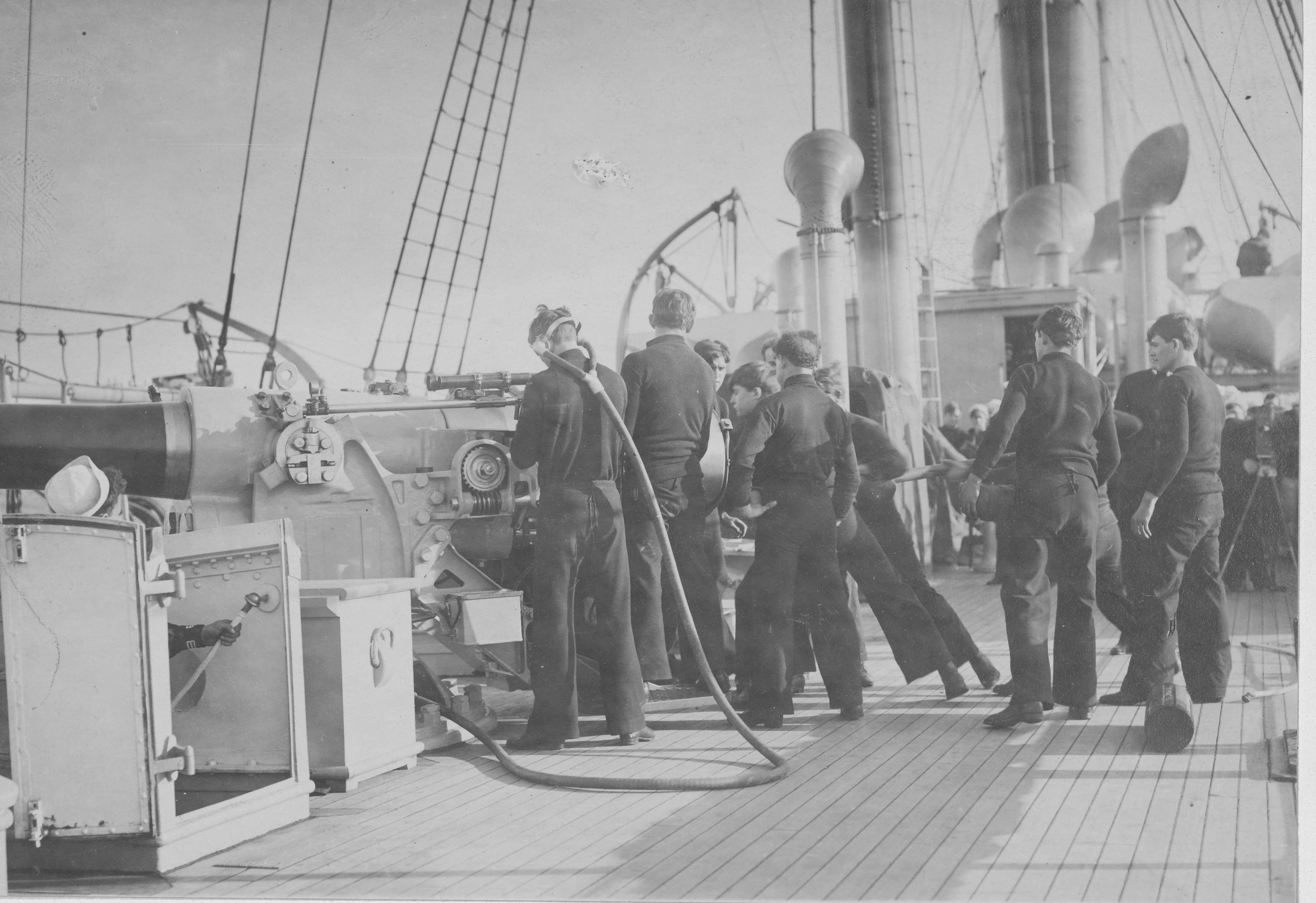 630k | Machine gun practice on USS Des Moines,. circa 1917-18. Photographer: E. Muller, New York, N.Y. | Record Group 165: Records of the War Department General and Special Staffs National Archives Identifier:45510735 Local ID: 165-WW-324C-23 Photo courtesy of catalog.archives.gov | |