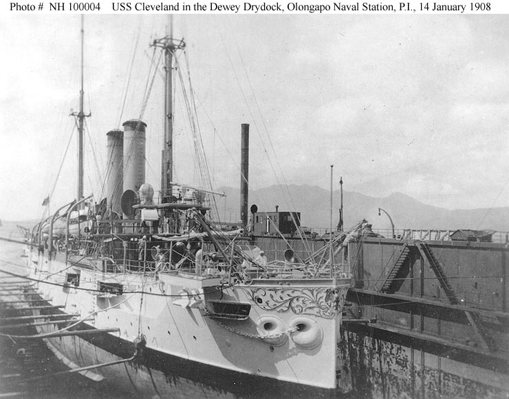USS Cleveland (Cruiser No. 19) In the "Dewey" Dry Dock, Olongapo Naval Station, Philippine Islands, circa 14 January 1908. Note her decorated stern and the officer posed on the starboard propeller. Copied from the Album of Assistant Paymaster Francis J. Daly, courtesy of Commander Thomas M. Daly, USN, 1984. U.S. Naval Historical Center Photograph #NH 100006. |