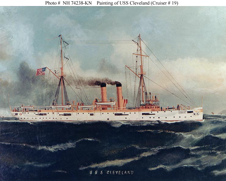 USS Cleveland (Cruiser No. 19) Painting by an unidentified artist. Courtesy of Mr. Fred Bristol, 1971. U.S. Naval Historical Center Photograph #NH 74238-KN. |
