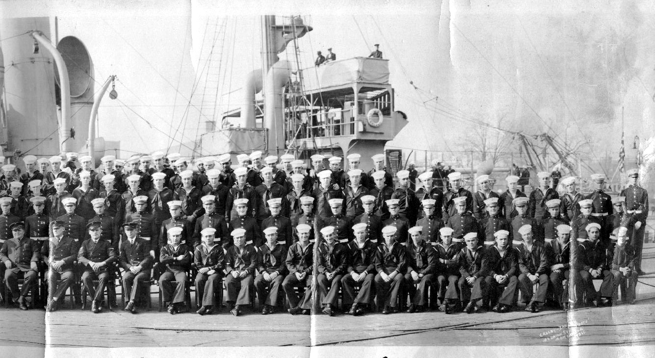 167k | Ship's Officers and Crew pose on the fore deck, circa 1918-1919, possibly while she was in Cuban or Honduran waters. The Sailor in the center of the image, in front of and just to the left of the pilot house's middle window (with his right arm in an "L" shape) is Fred Dewey Francis, Sr. Note the capstan and life ring in the foreground, and splinter mats placed around the ship's bridge and pilot house. Donation of Mrs. Aileen F. Rice, 2005, from the collection of her father, Fred Dewey Francis, Sr. (1898-1929). |